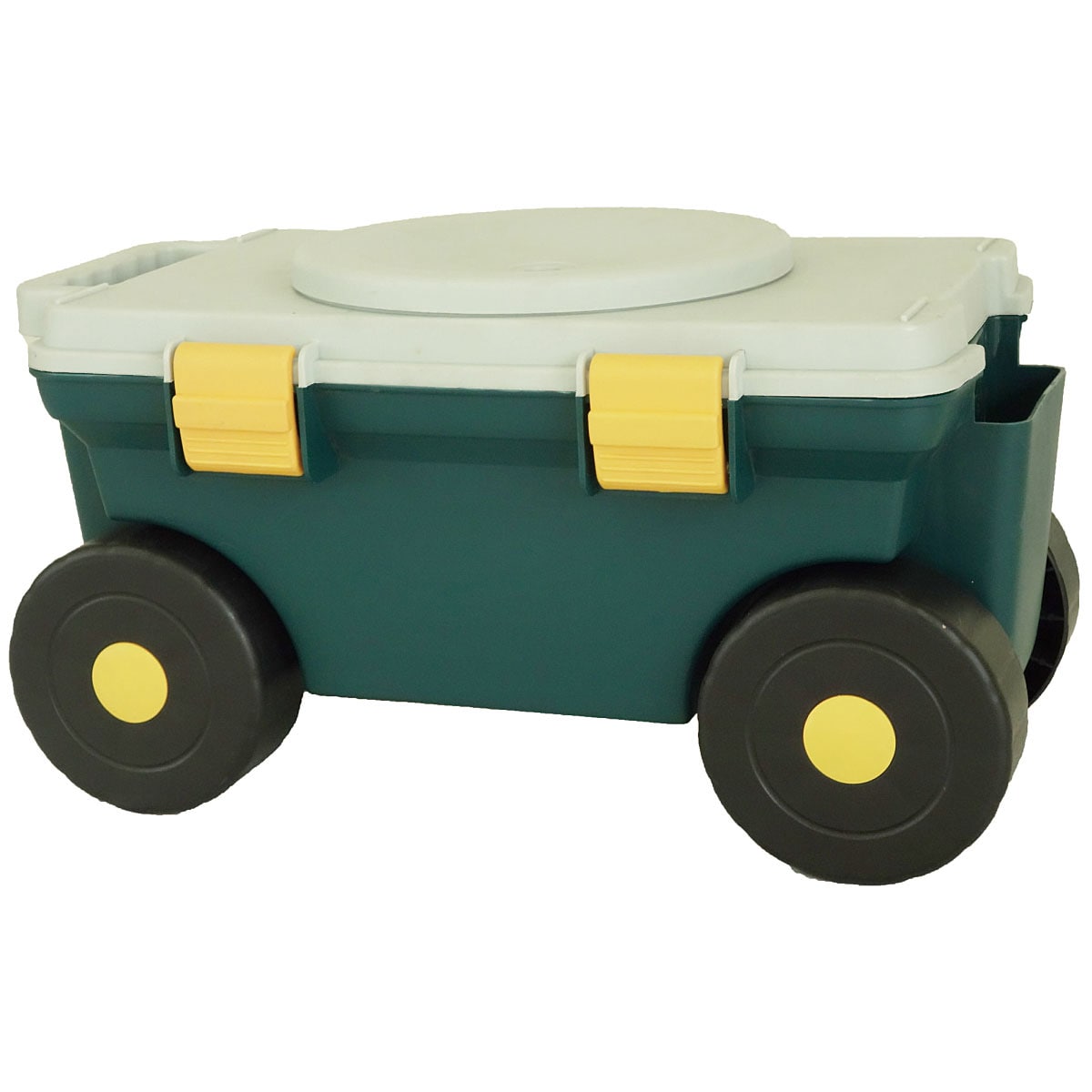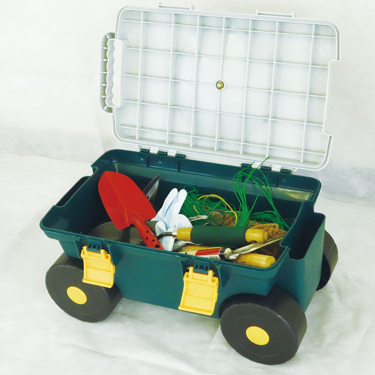 草取りやガーデニング作業がラク!座ったままで方向転換や移動もOK。カートの中には肥料や庭仕事の道具も入れられます。両側にサイドポケットがついていて、スコップなどサッと入れられて便利です。