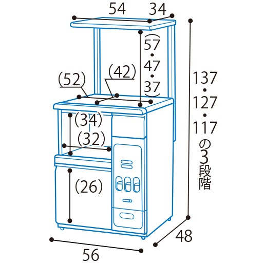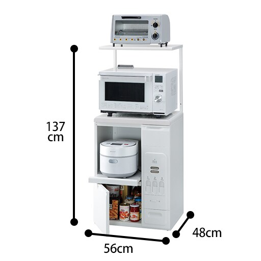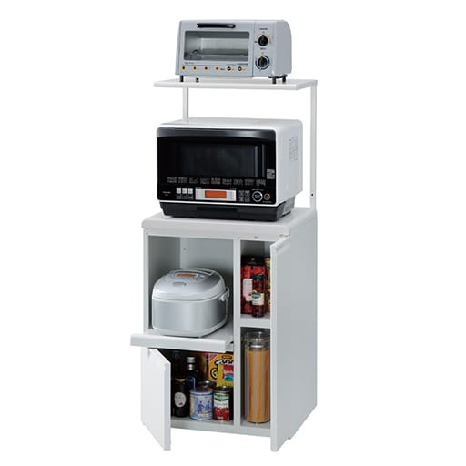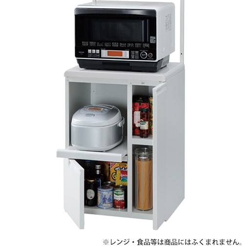 ロータイプのレンジ台。中段のスライドテーブルはスライド幅27cmで、炊飯器が使いやすく設置できます。上棚板は電子レンジの大きさに合わせて10cmピッチで3段階に高さが調節できます。2口コンセント付き(合計1500W)。