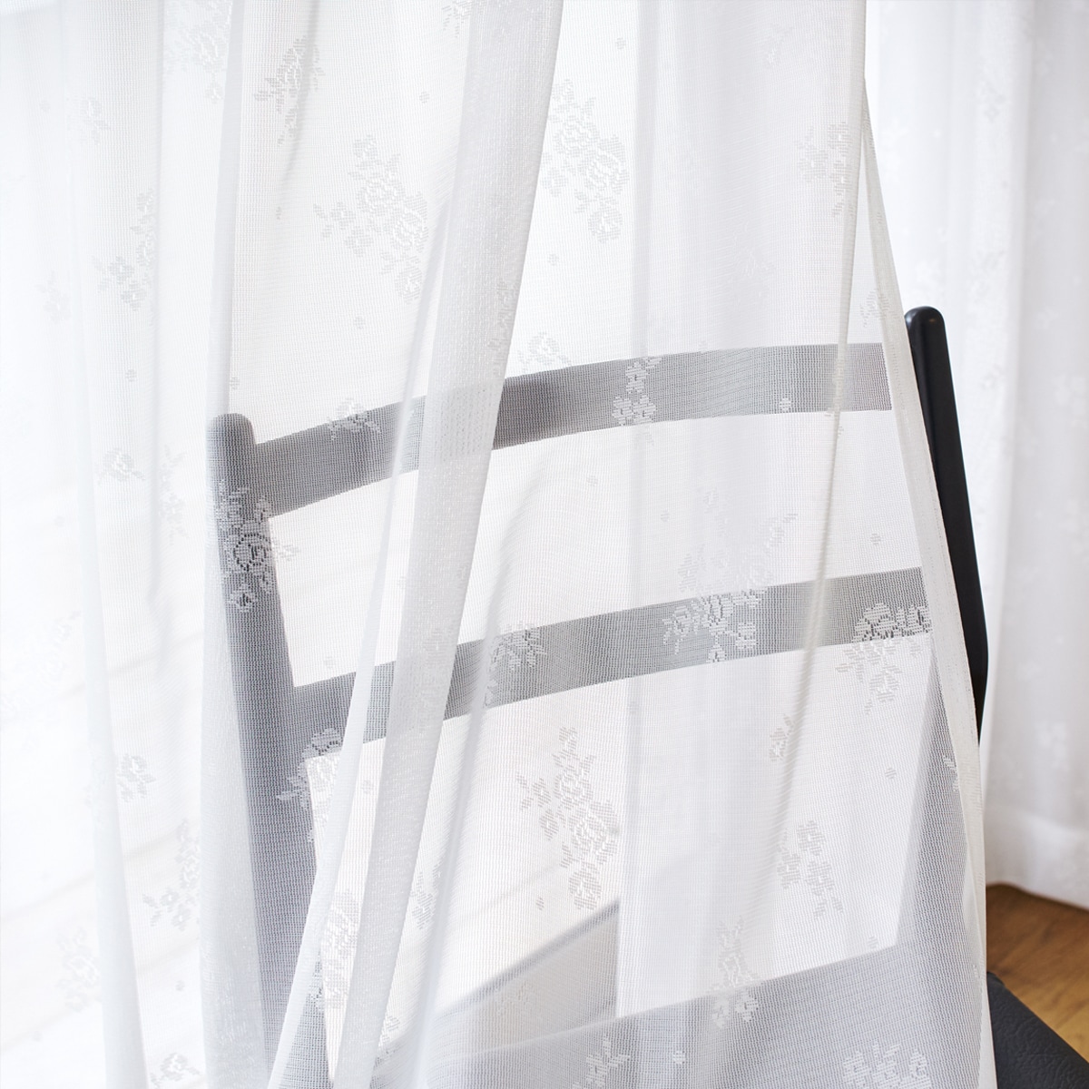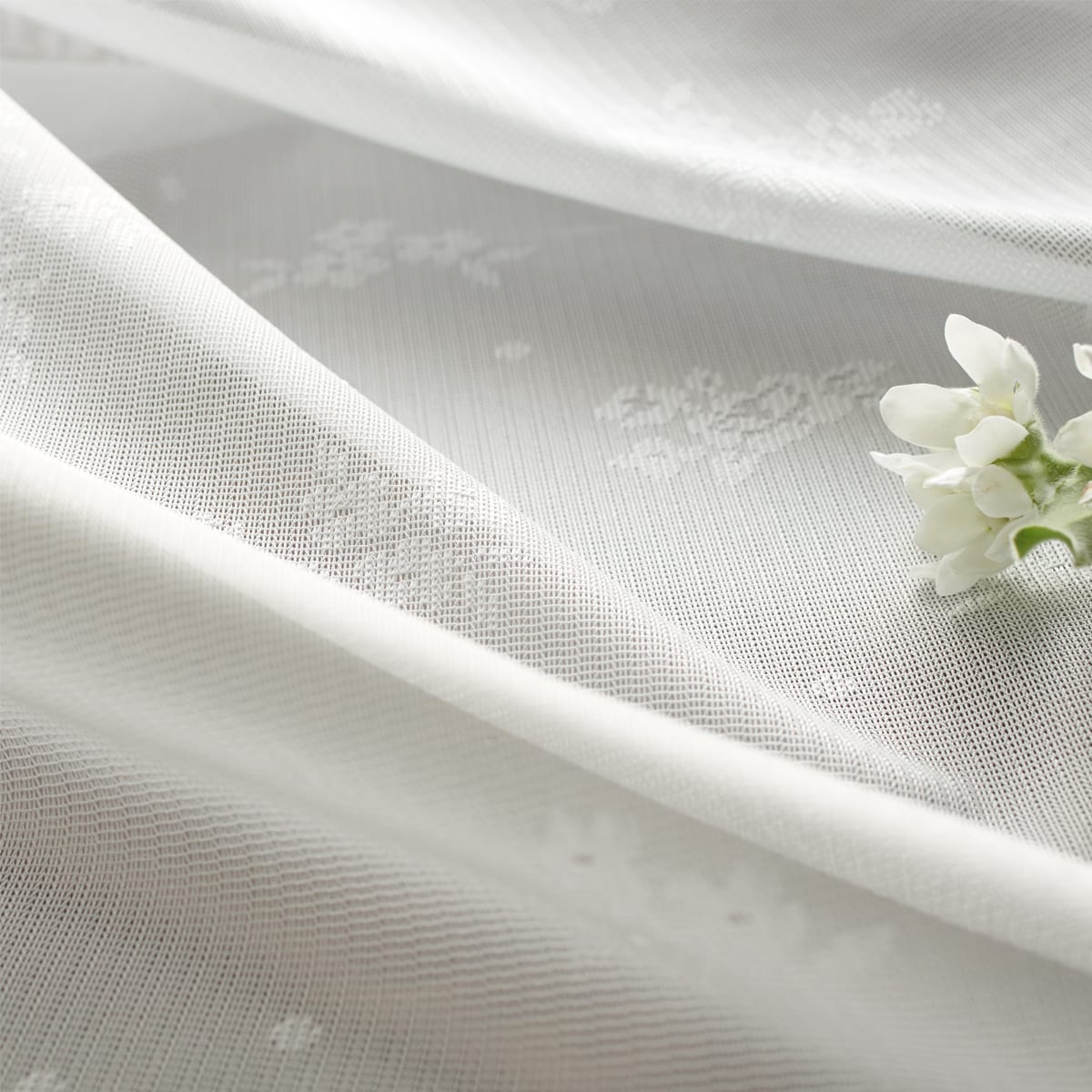 オフホワイトエレガントな小花柄が上品な印象の、透け感が心地よいレースカーテンです。