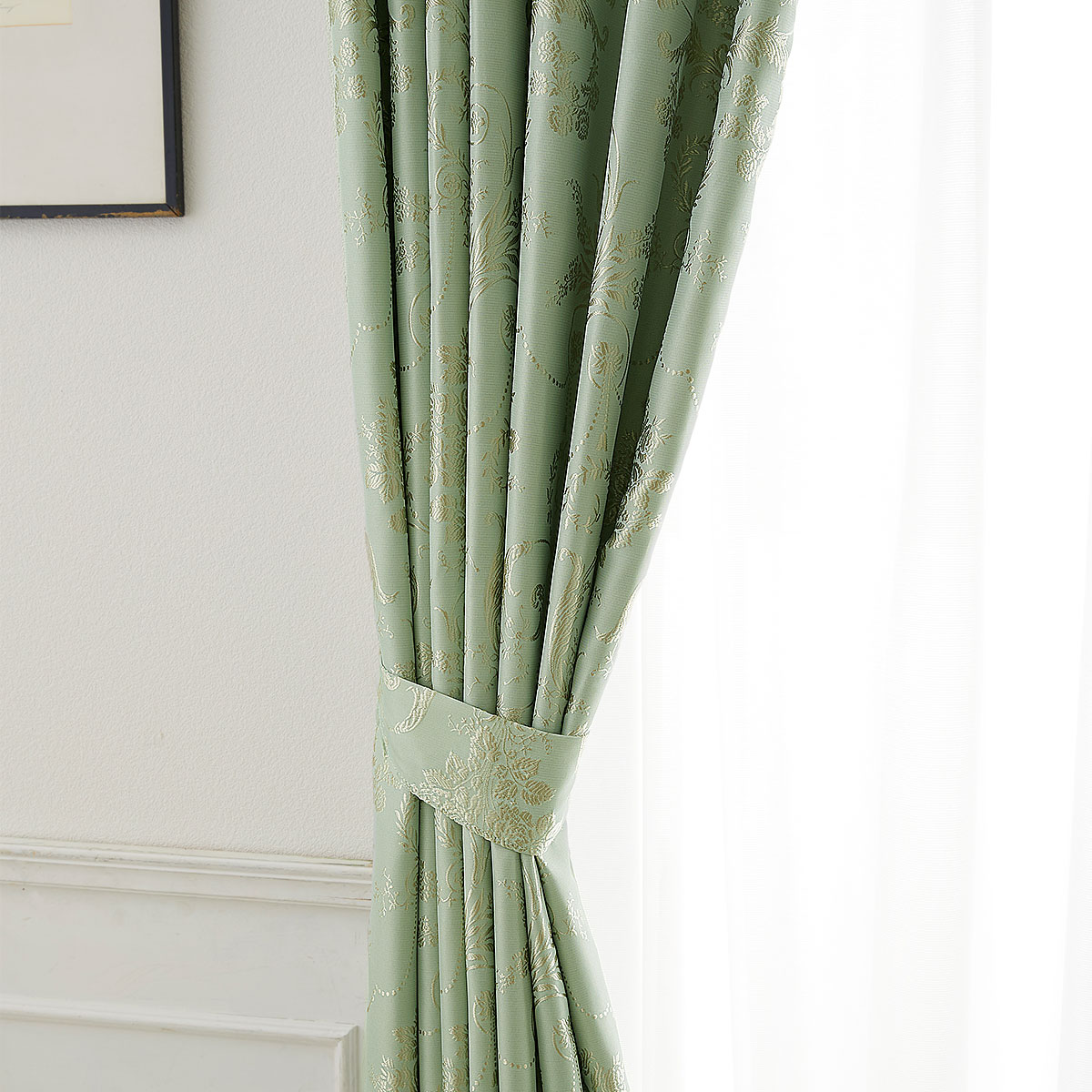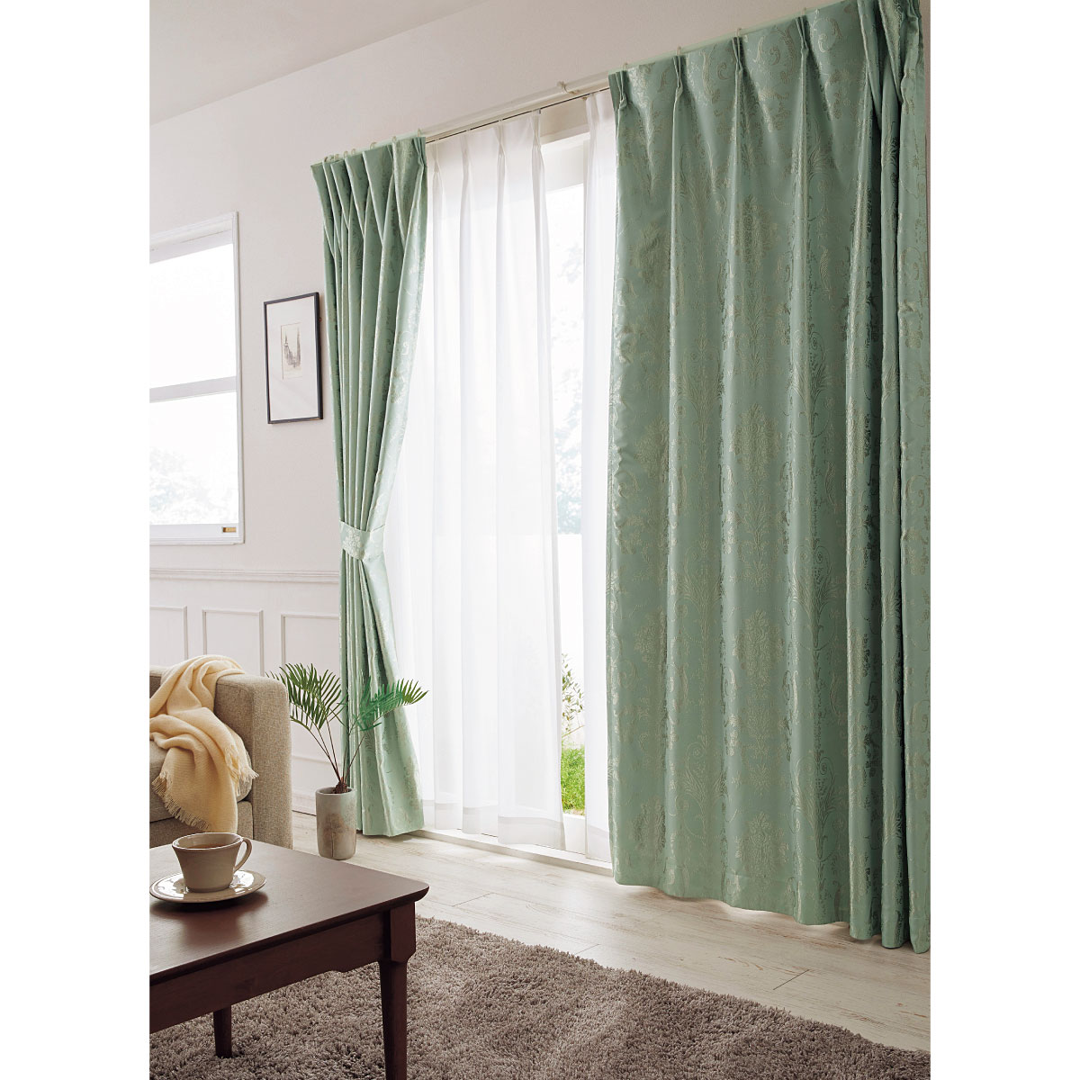 パウダーグリーン ※レースカーテンはVP-1055を使用しています。朝日や西日がまぶしいお部屋の窓にもおすすめ。