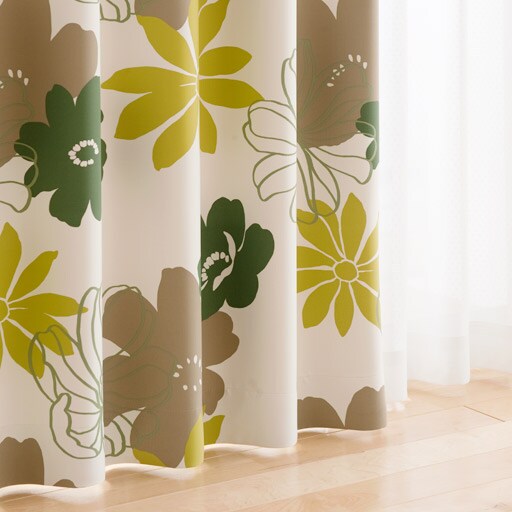 お部屋を簡単にかわいくしたい! そんなワガママを叶える、大きな花モチーフが可愛いプリント遮光カーテンです。ほどよく光をやわらげ、お部屋が明るく感じられる2級遮光なので、お休みの日は太陽の日差しを気にせずにゆっくりと眠りたいという方、プライバシーが気になる女性の一人暮らしなどにもおすすめです。形状記憶加工を施しているので、届いたときからキレイなドレープが長続きし、開け閉めもスムーズです。