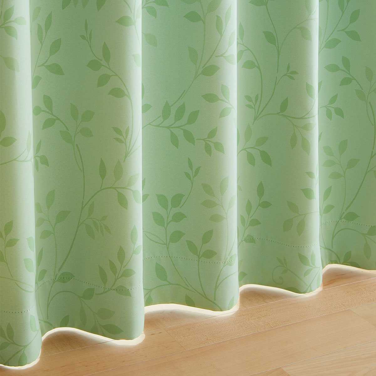 グリーン落ち着いた色と風合いでインテリアに合わせやすい、総リーフ柄のカーテンです。