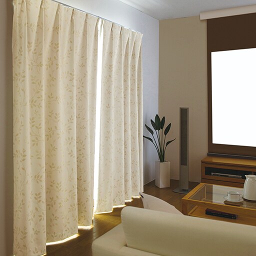 99.99%の遮光率で、夜の光漏れも防ぐ1級遮光カーテンです。朝日や西日がまぶしいお部屋や、ぐっすり眠りたい方の寝室などにもおすすめ。外の視線から室内をガードして、プライバシーも守ります。遮熱・保温効果も高いので冷暖房効率もアップ。さらに防炎機能付きで高層マンションにお住まいの方も安心です。ナチュラルなリーフ柄で、お部屋になじみやすいデザインです。日本で丁寧に縫製して仕上げた国産仕様です。
