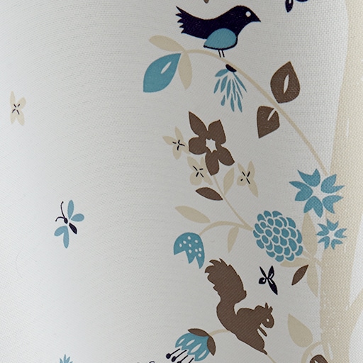 ブルー森に集まるリスや鳥たちを北欧風に表現した、とっても可愛いプリントカーテンです。