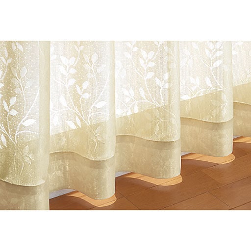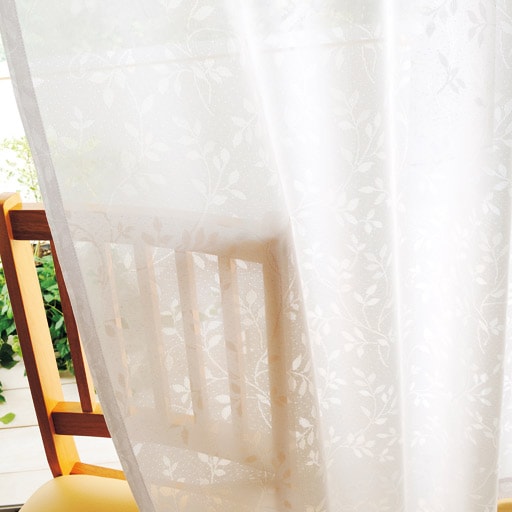 【オーダー】防炎・UVカット・ミラー効果の機能がついた、リーフ柄のレースカーテンです。レースカーテンのカラーも部屋の雰囲気に合わせて選びたいという方におすすめの4色展開。1cm単位でご注文できるオーダー商品です。
