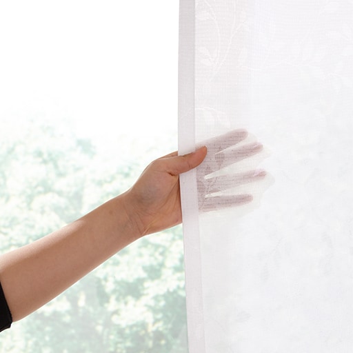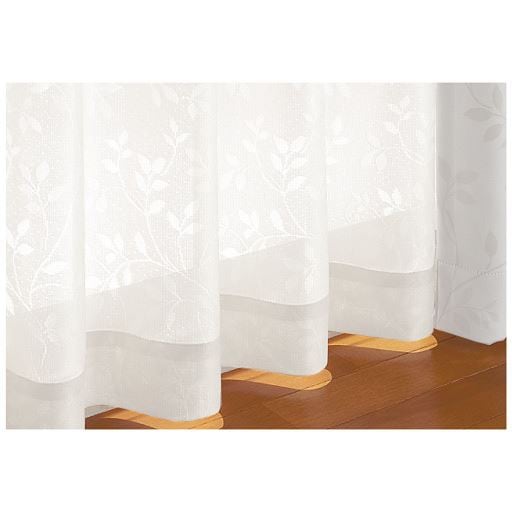 ホワイト防炎・UVカット・ミラー効果の機能がついた、リーフ柄のレースカーテンです。