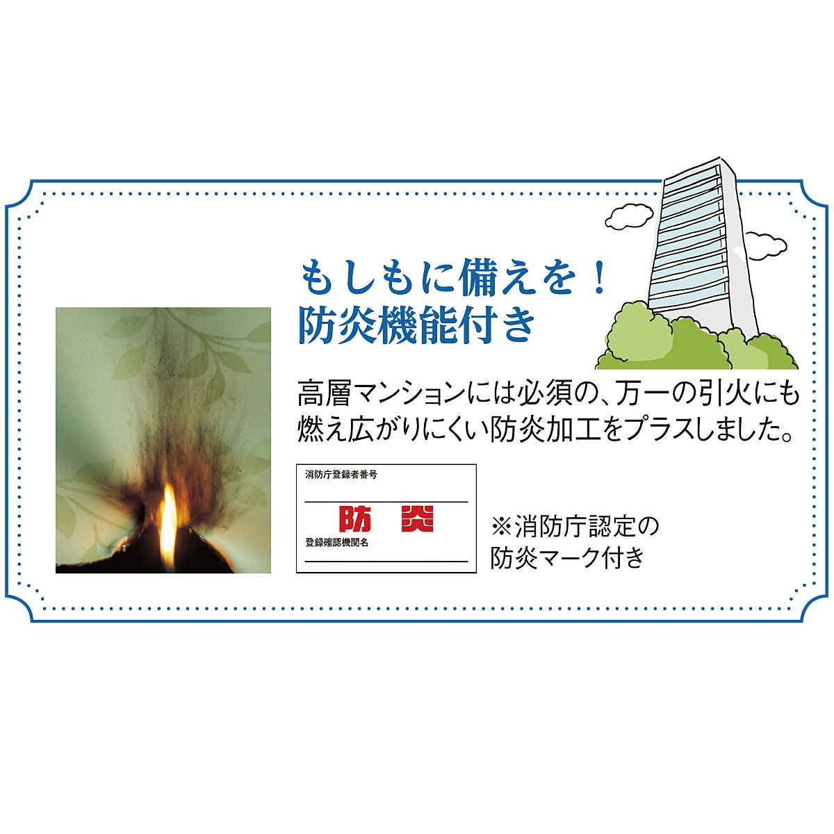 万が一引火しても炎が燃え広がりにくい防炎加工付き。※防炎は不燃とは異なり、あくまでも燃えにくいという性能を示すものです。