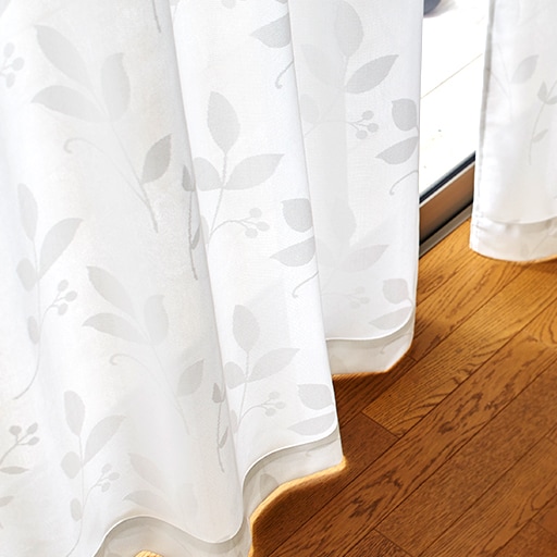 オフホワイトシンプルな大判のリーフ柄が美しい、ミラーレースカーテンです。