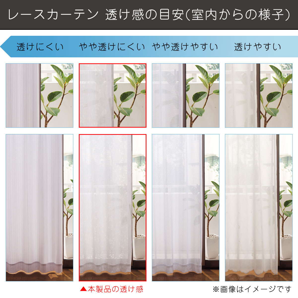 【レースカーテンの透け感の目安(室内からの様子)】UVカット率・遮熱保温効果・目隠し効果の高いレースカーテンは、一般的なレースカーテンに比べて室内から外が見えにくくなります。また、昼間はお部屋の中が若干暗く感じる場合があります。※商品の素材感や色味・使用環境により異なりますのであくまで目安としてください。
