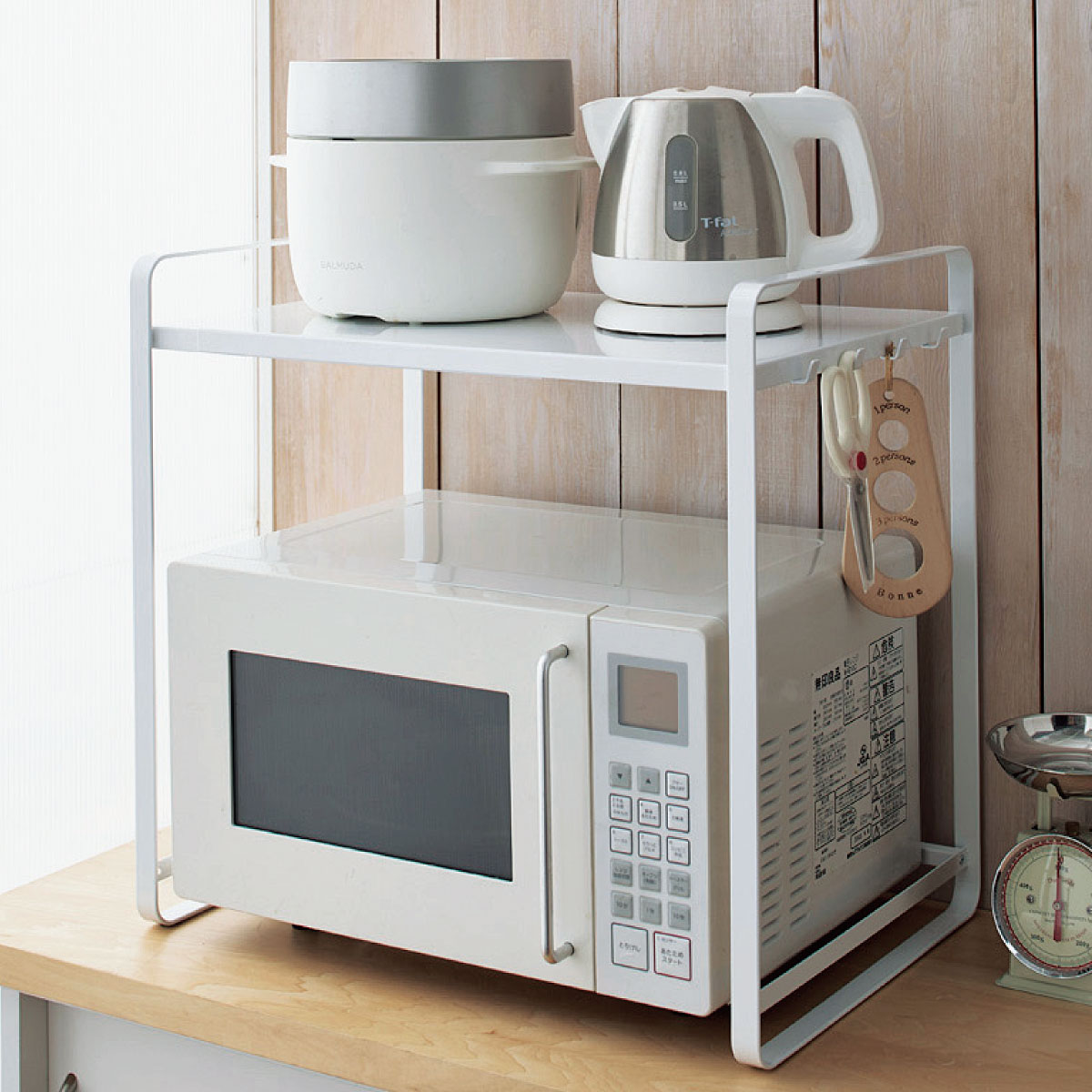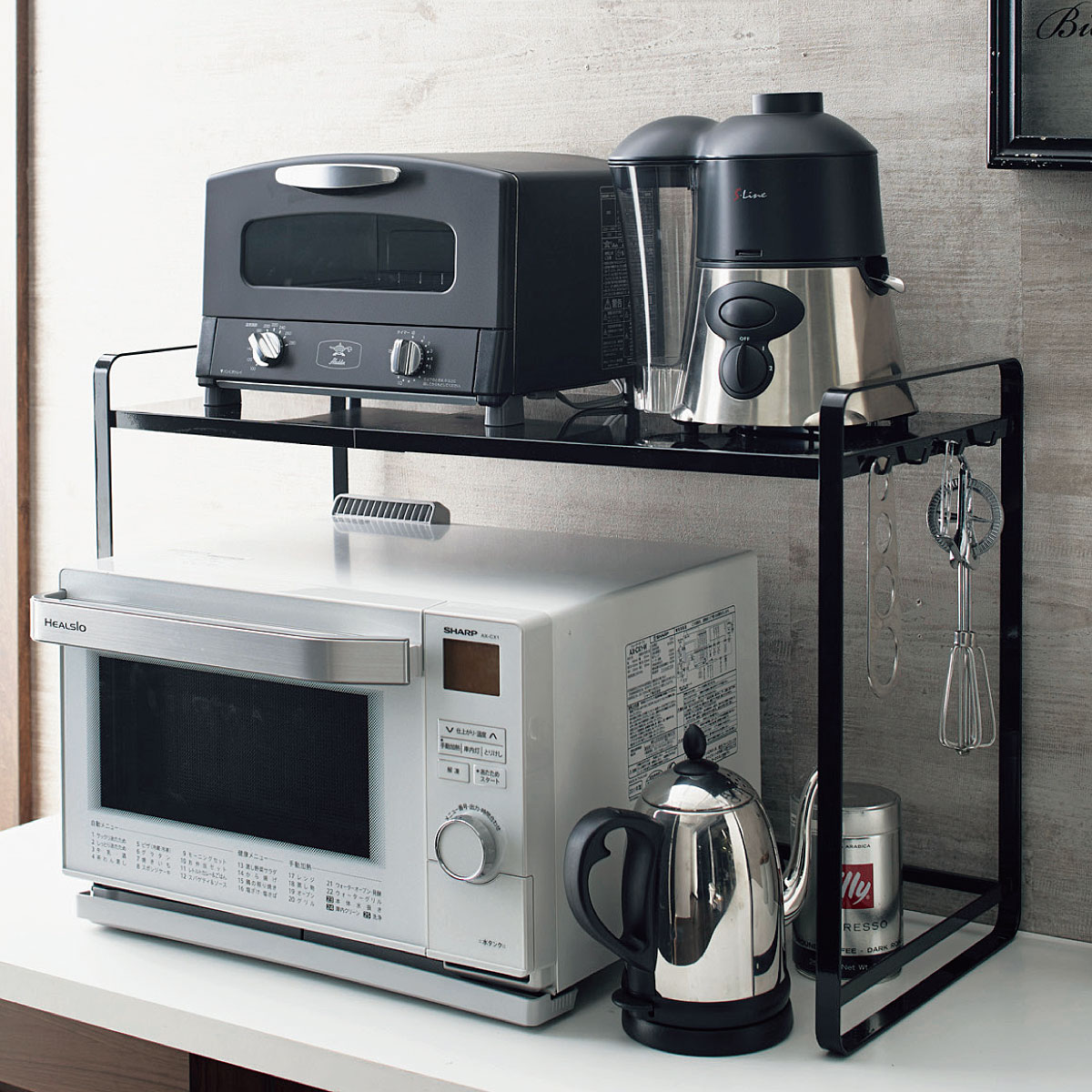 スペースや収納するものに合わせて伸縮可能なシンプルラック。場所をとるキッチン家電を省スペースに収納。