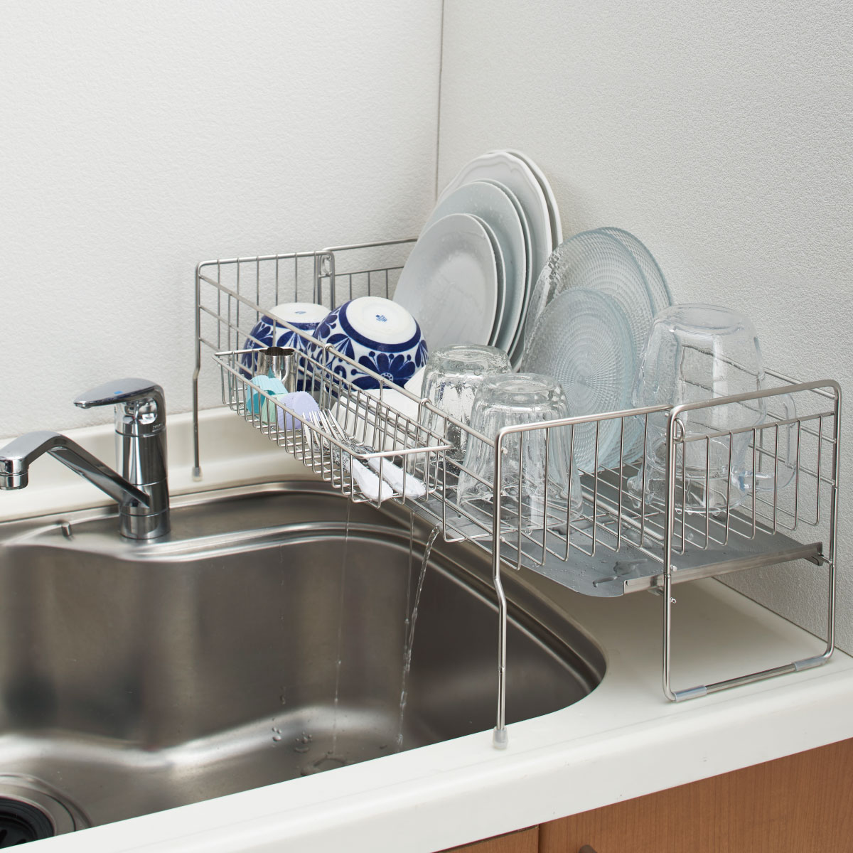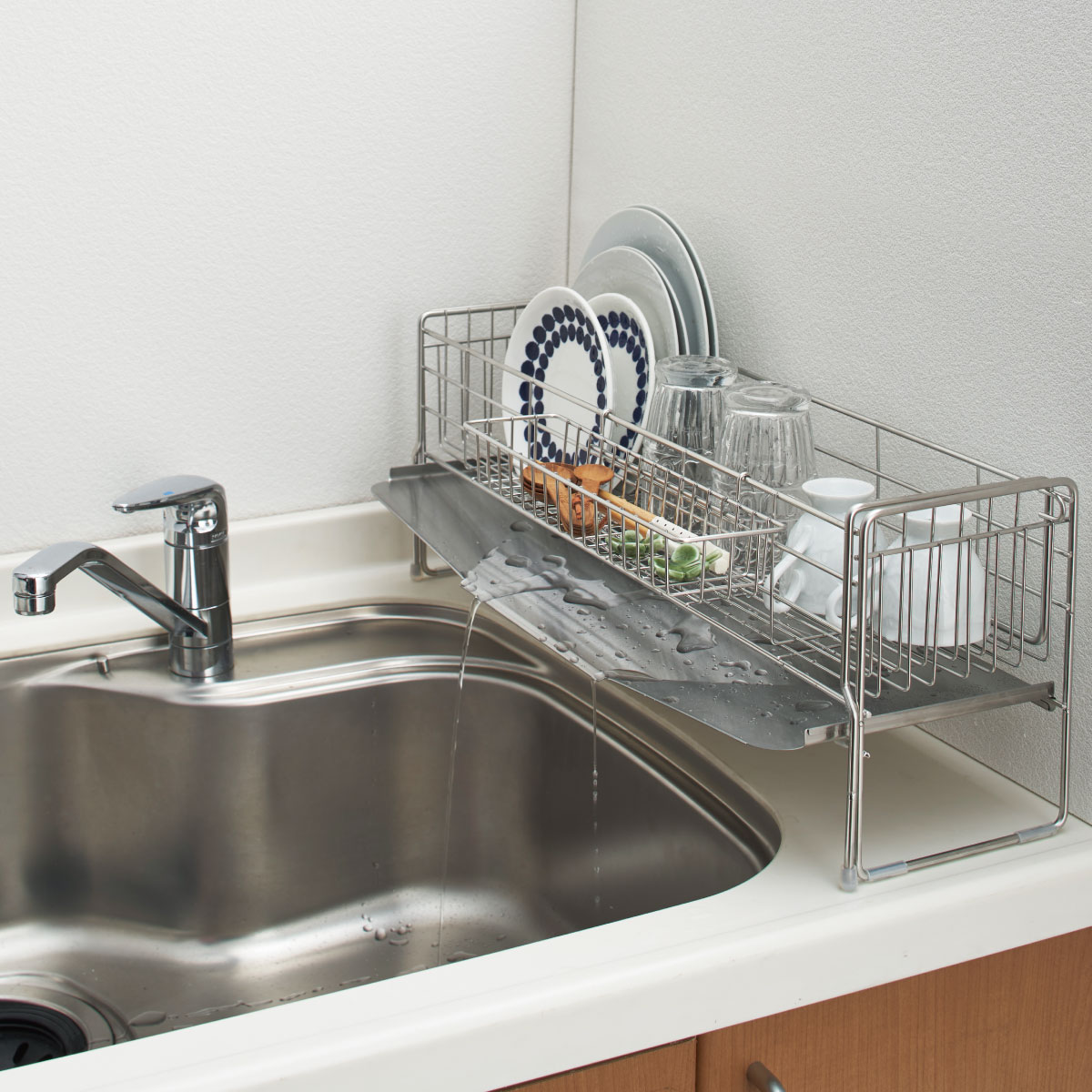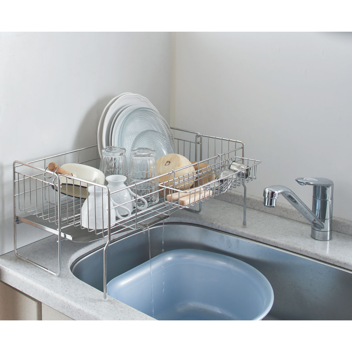 シンク内に洗い桶を置いても水切りかごのトレーが邪魔にならずスペースを有効活用できます。