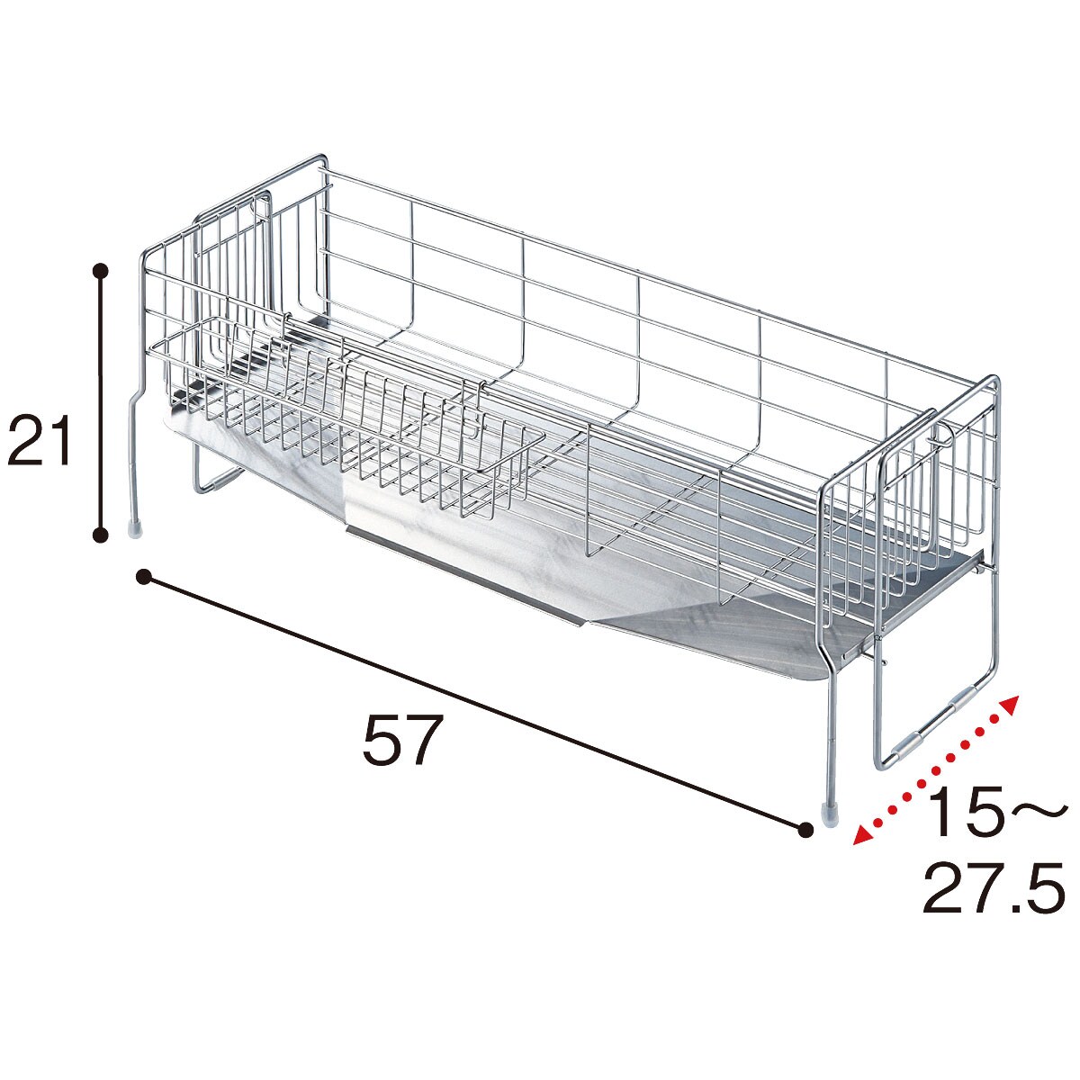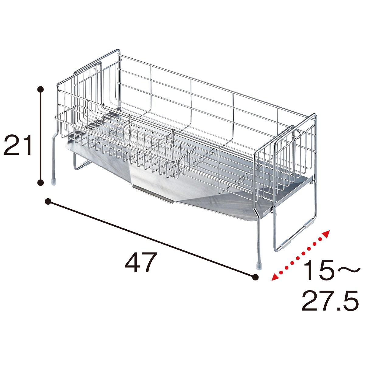 ※斜めトレーは水切りかごを広げた際には下にきません(最小に縮めた際に合わせております)