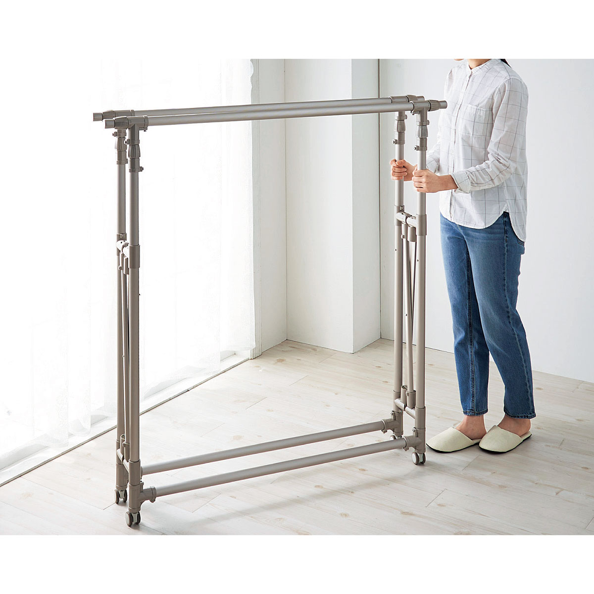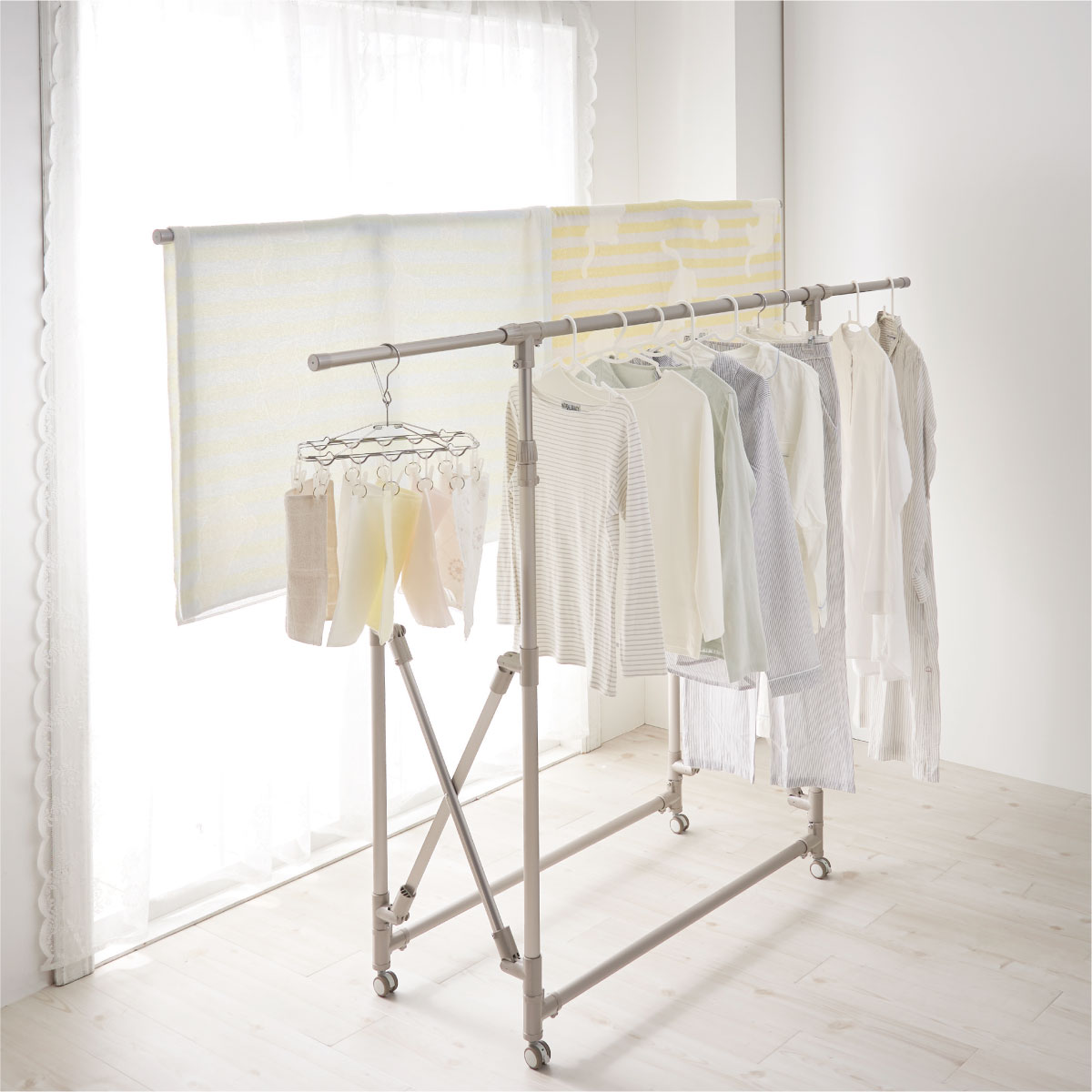 大量の洗濯物はもちろん、布団も干せる頑丈設計の室内物干し。干すものやスペースに合わせて幅と高さが変えられます。アルミ製でサビにくいのも嬉しいポイント!