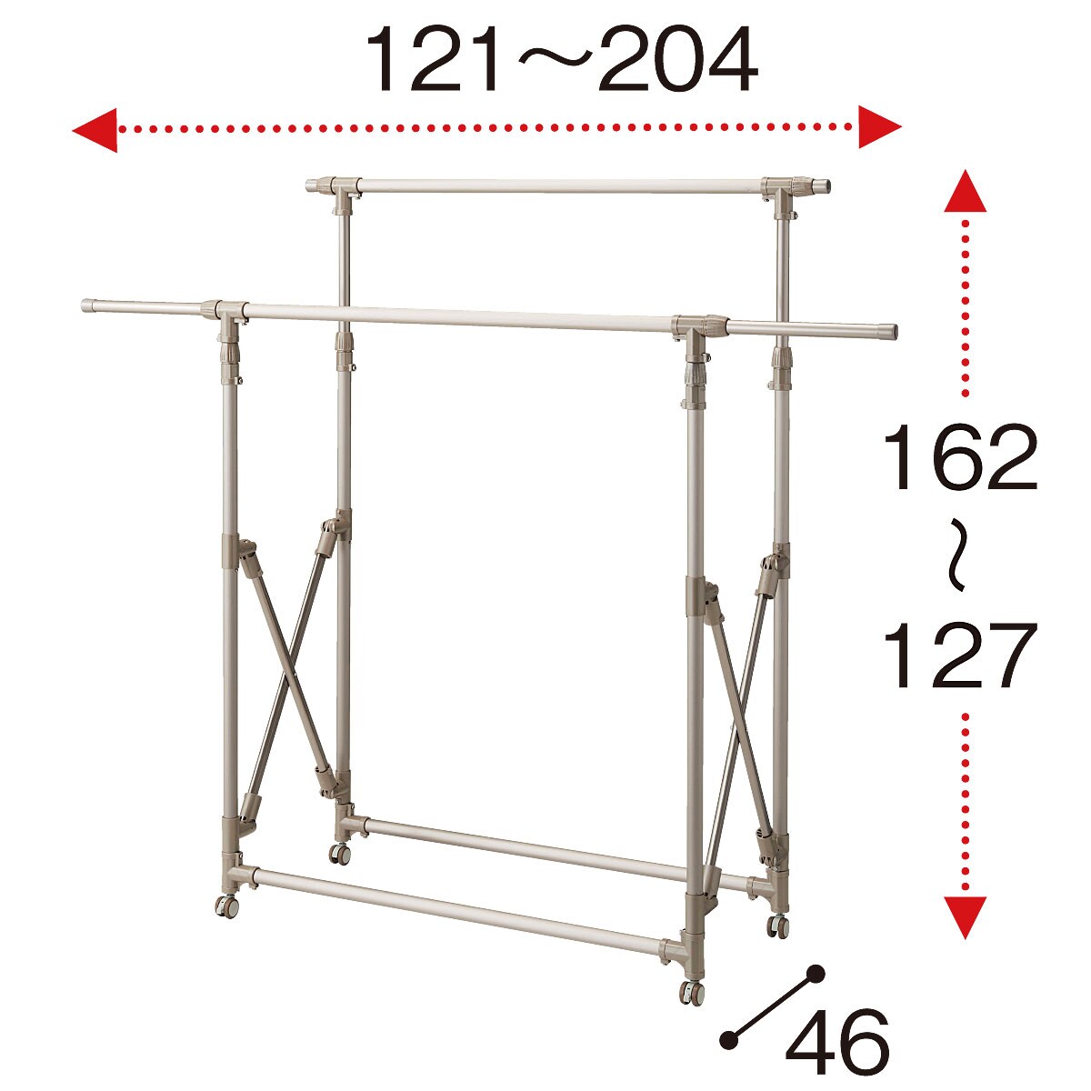 ■アルミ合金パイプ、ABS樹脂 ■サイズ(約cm)/幅121~204×奥行46(収納時:18)×高さ127~162 ■重量/約4.5kg ■耐荷重/約20kg●日本製【小型別配送】 【組立式15分】※沖縄県や一部島しょ部など配送上の都合によりお届けできない地域がございます。