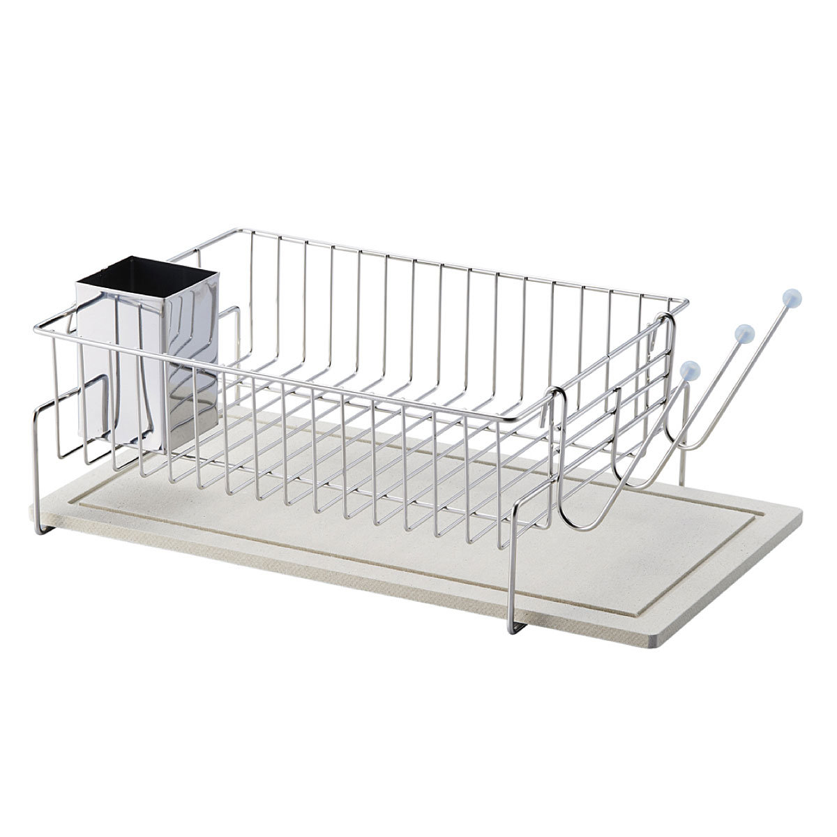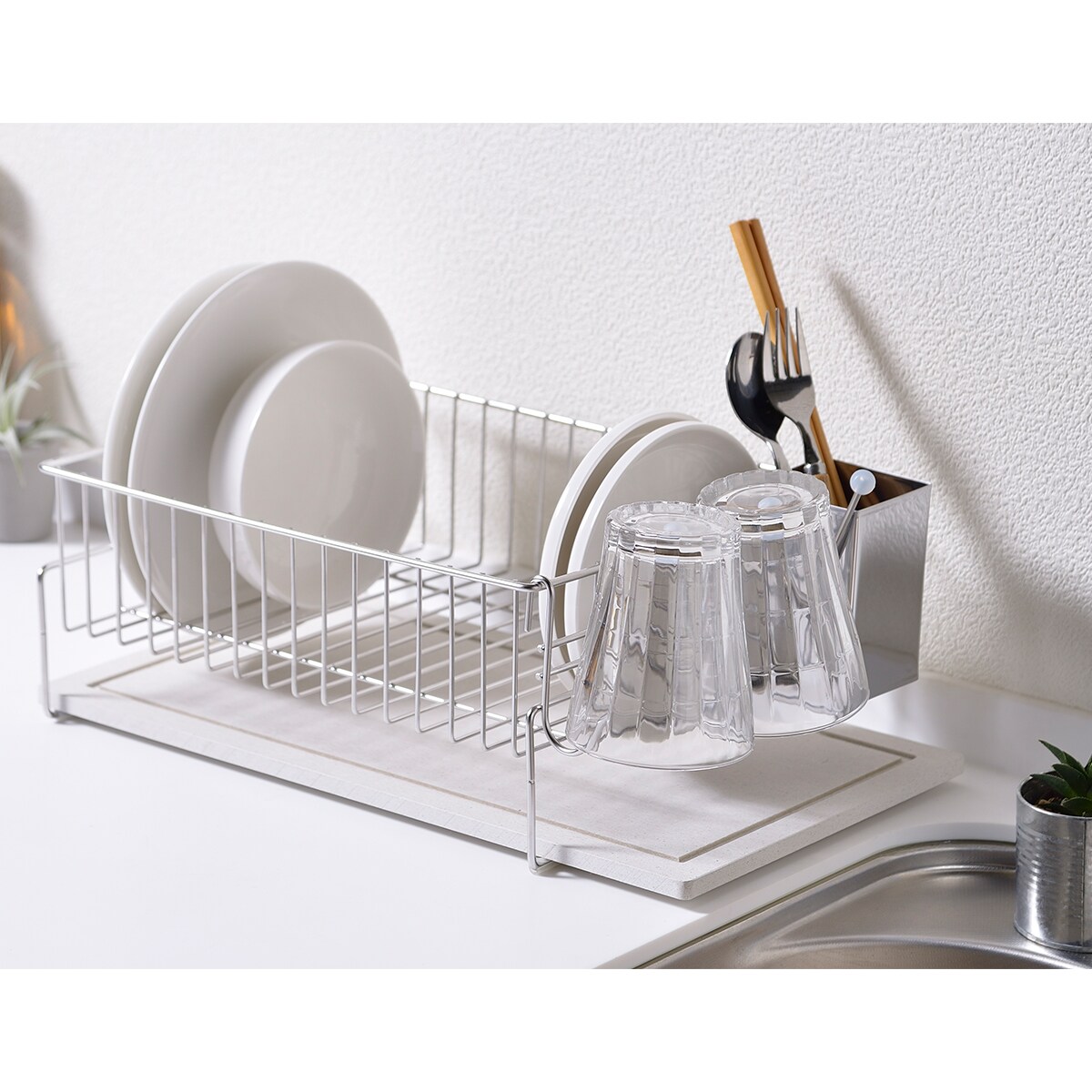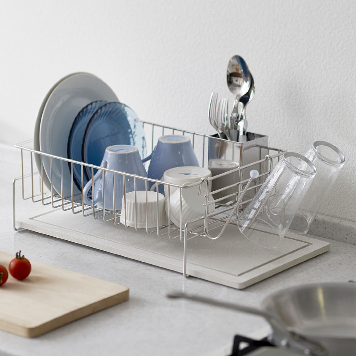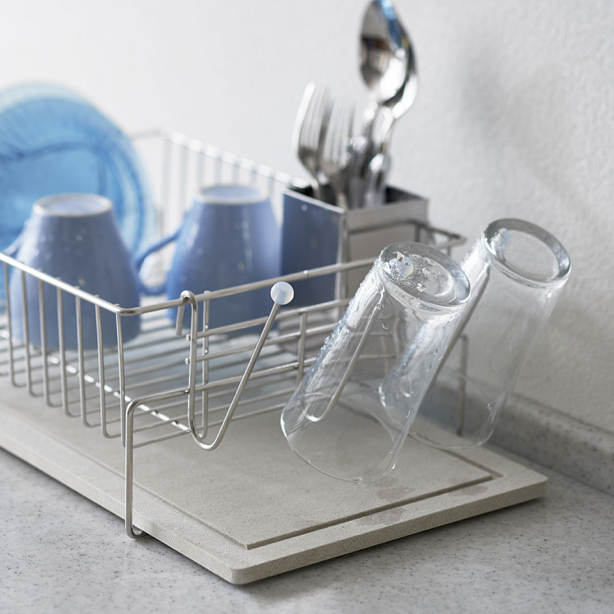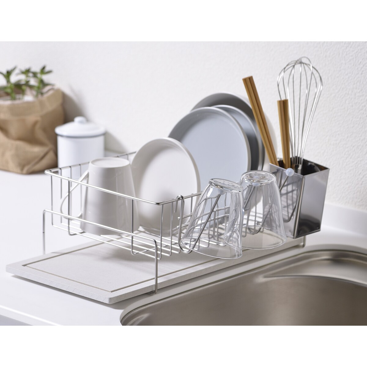 吸水プレートで水を吸って、お手入れ簡単な水切りラック。トレイが洗い物の水を吸水するので、シンク横だけでなくカウンター上や出窓などどこでも水切りできます。