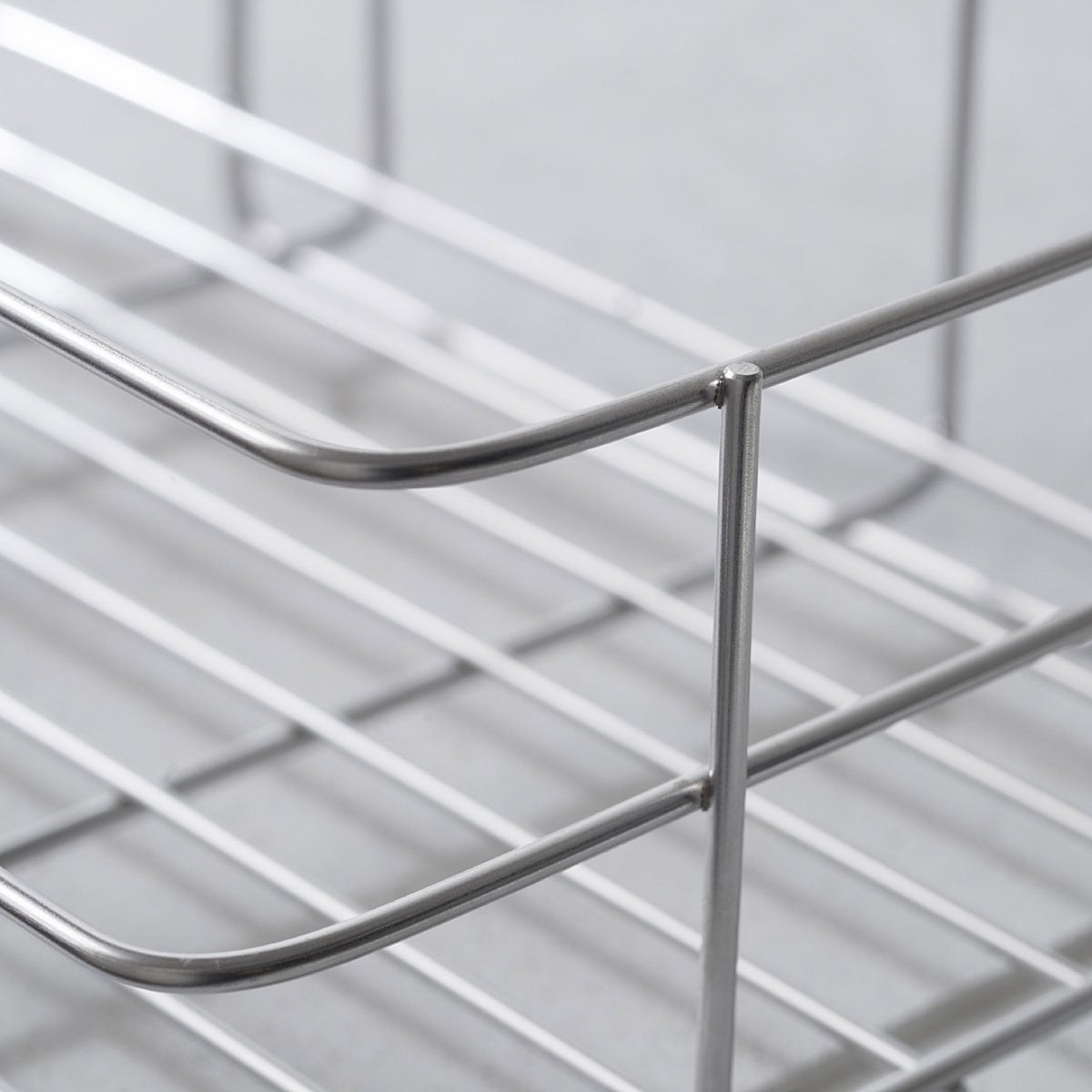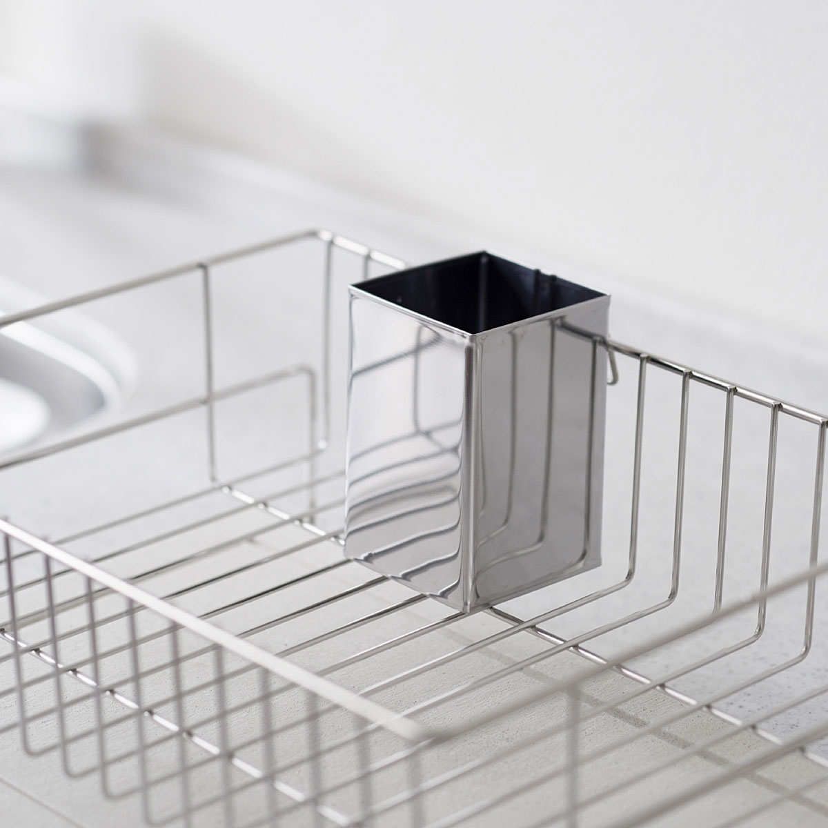 水受けトレイが吸水プレートになっているから、水が溜まりにくく衛生的な水切りカゴです。本体は、皿を立てやすいワイヤー間隔になっています。箸立てとグラスホルダーを付属しているので、効率的に水切りできます。