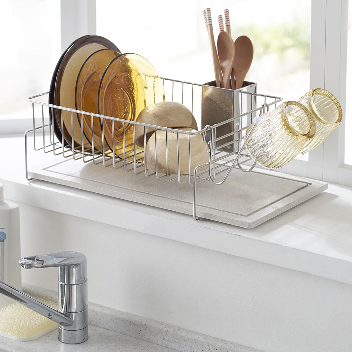 吸水プレートで水を吸って、お手入れ簡単な水切りラック。トレイが洗い物の水を吸水するので、シンク横だけでなくカウンター上や出窓などどこでも水切りできます。