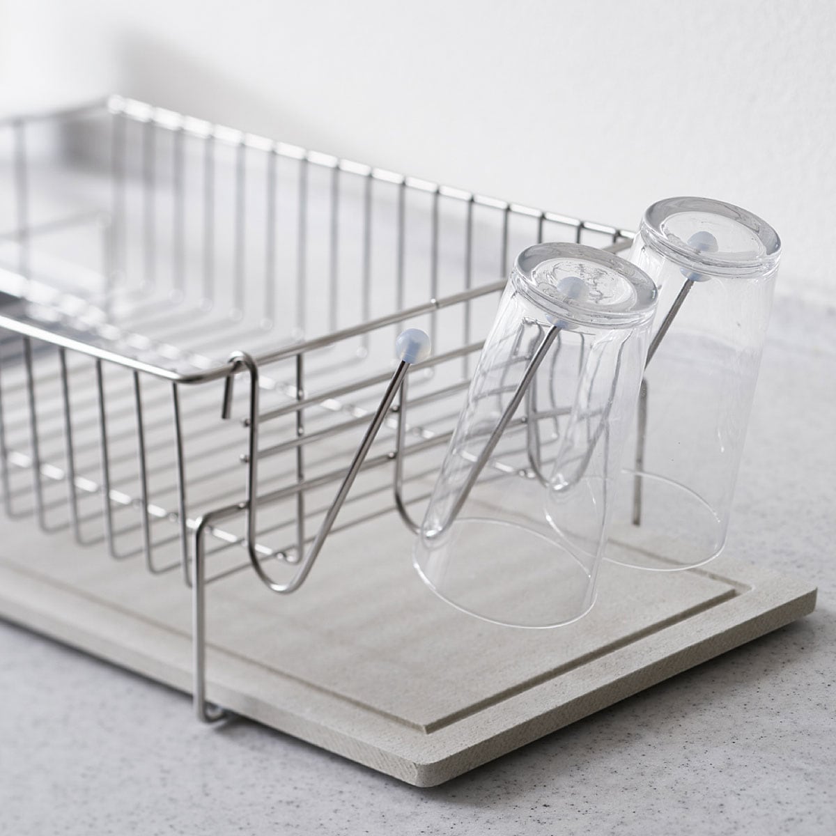 水受けトレイが吸水プレートになっているから、水が溜まりにくく衛生的な水切りカゴです。本体は、皿を立てやすいワイヤー間隔になっています。箸立てとグラスホルダーを付属しているので、効率的に水切りできます。
