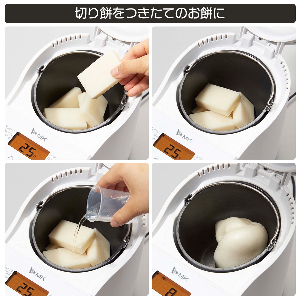 もち米からつきたてのお餅を作る【もちつきコース】と切り餅や丸餅からジャーマンポテトやミネストローネやフルーツ杏仁もちなどのスイーツまで日常で使える料理にアレンジできる【アレンジコース】を搭載した全自動もちつき機。
