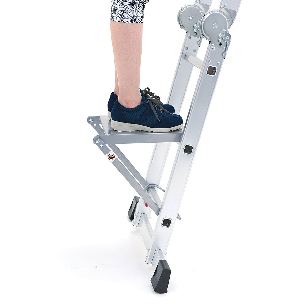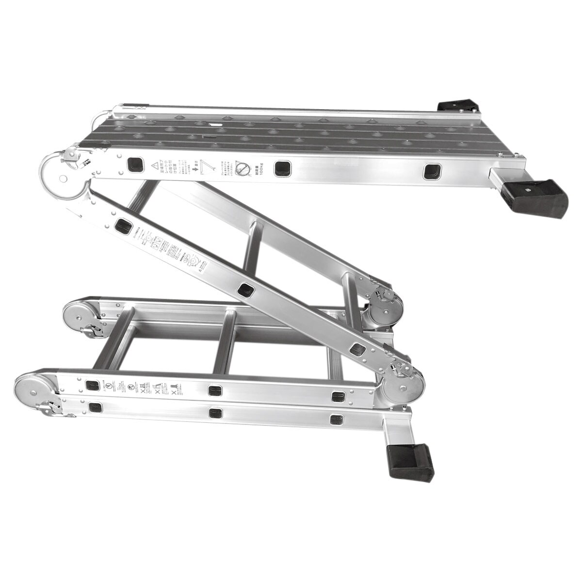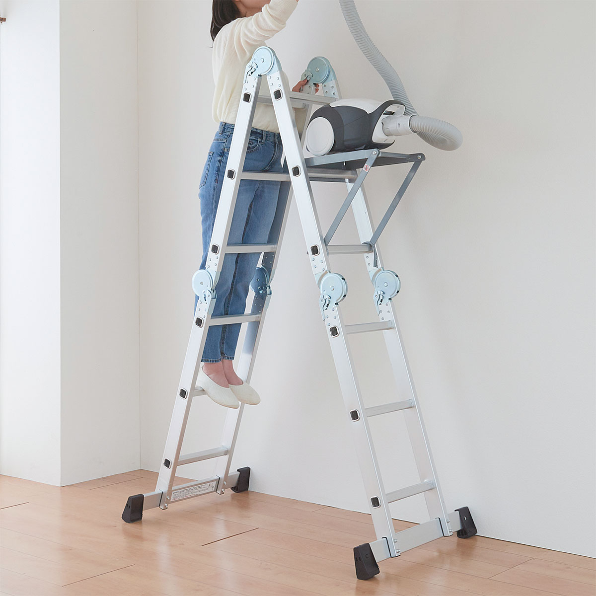 8つの形状に変形するから、屋内外を問わず家事や掃除、洗車やDIYなど様々な作業が楽になります。本体はアルミ製、着脱可能な作業台付きで作業がさらに捗ります。ロック機能やステップ板など、安全面にも考慮しているので、女性でも扱えます。使わないときはコンパクトに収納できます。