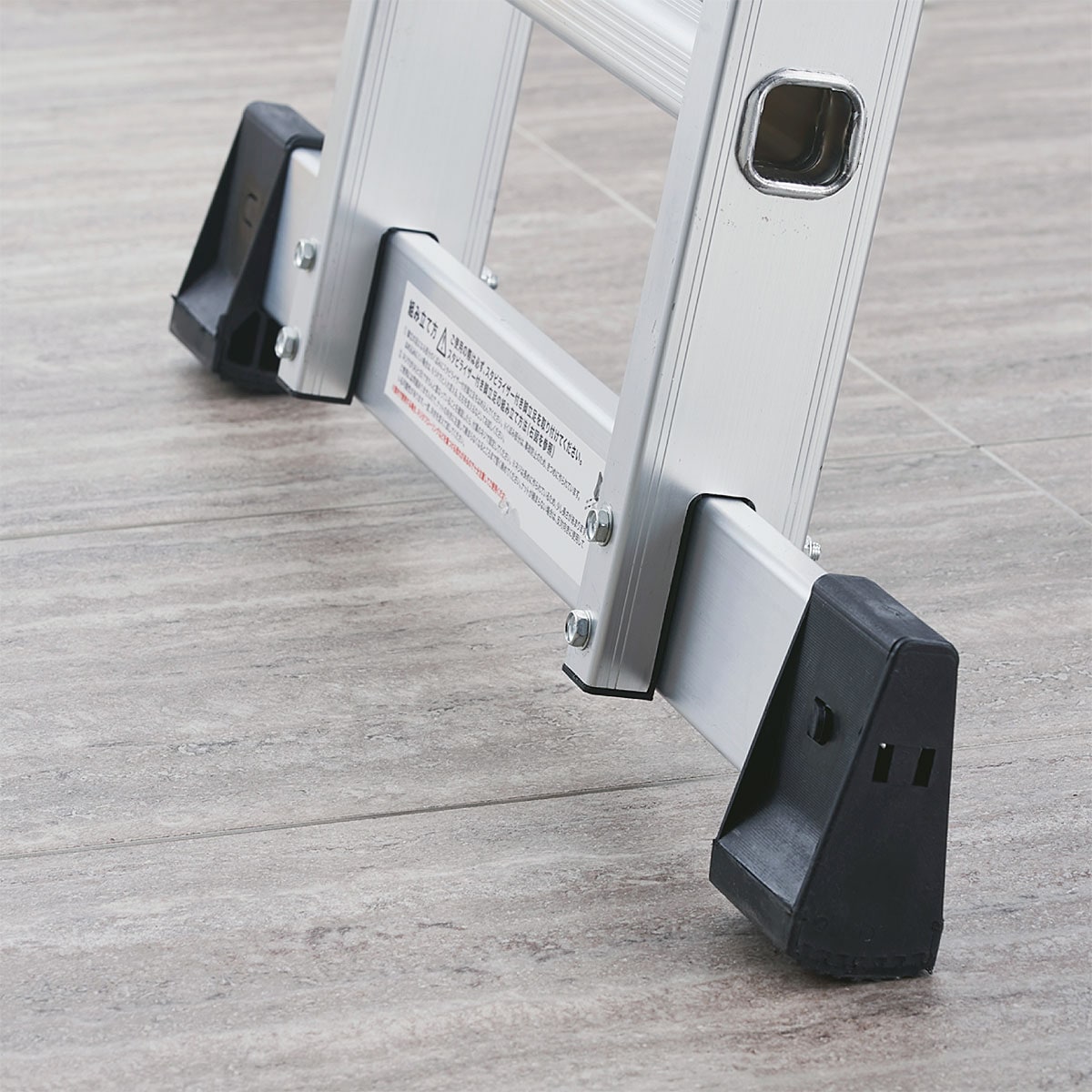 地面をしっかり捉える横倒れ防止用の足(スタビライザー付脚立足)が付いているので、安定感があります。