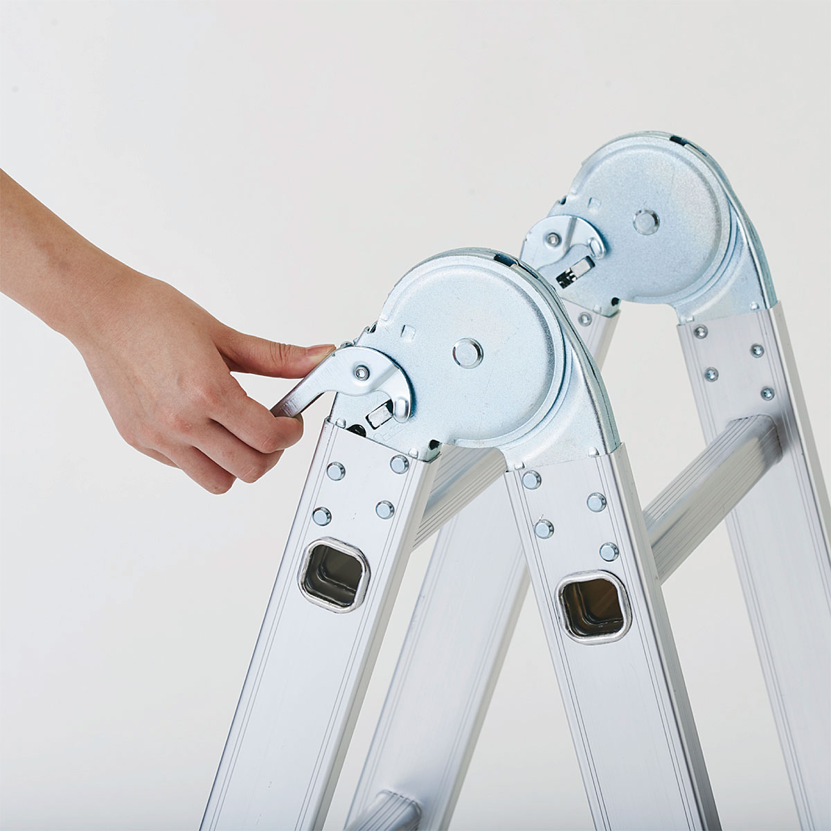 可動部は角度を合わせるとカチッと音がして自動でロックされます。また、ロック解除レバーを引くだけでワンタッチでロック解除ができるので、簡単に関節部分を折り曲げて脚立を変形できます。