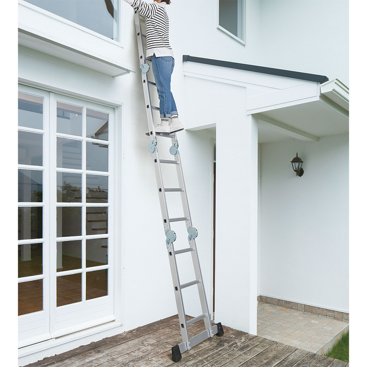 こんなときに便利…家の外壁掃除にちょうどいいサイズ感です。2つに折りたためば、使い勝手のいい小型のはしごに変身。