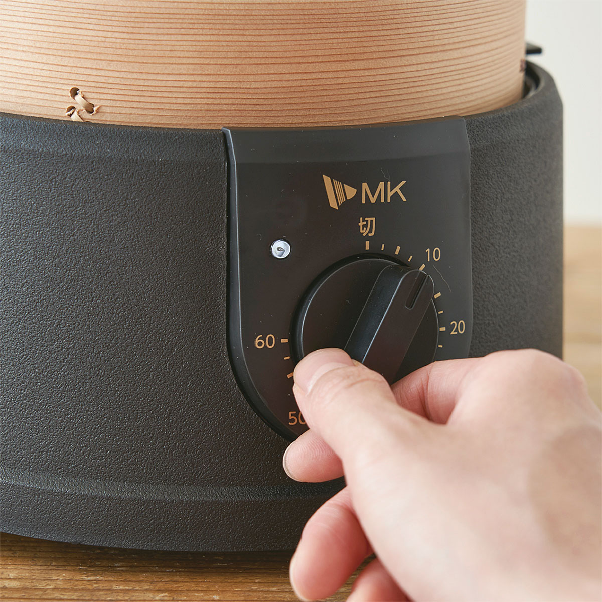 スイッチはダイヤル1つの簡単操作。タイマー時間は最大60分まで設定できます。設定した時間になると、タイマーが「チーン」と鳴って完成をお知らせ!