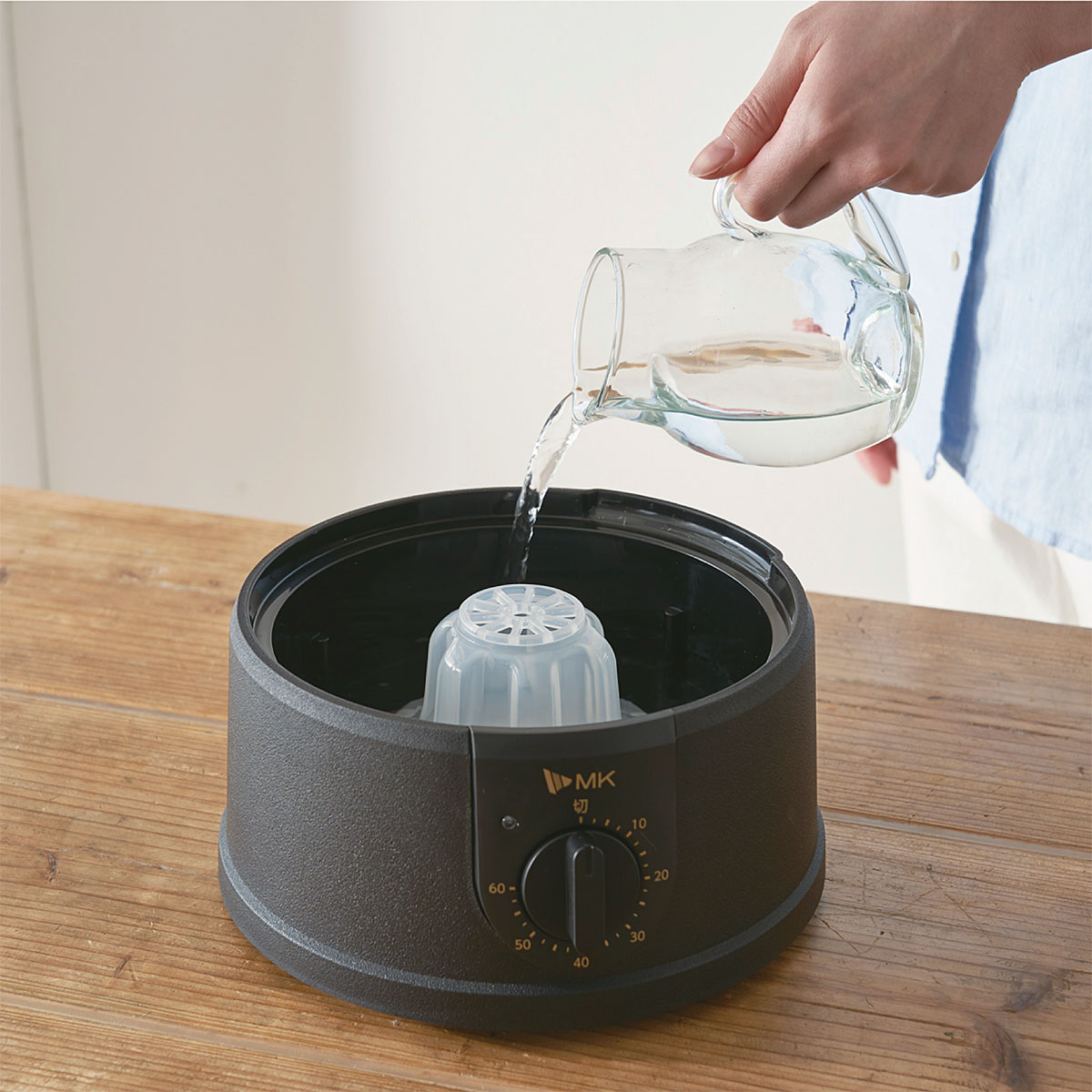 本体の水タンクに水を入れれば準備完了!蒸し時間に応じた水位線がついているので、水を入れるのも楽々。あとは食材を入れたせいろを重ねるだけ。