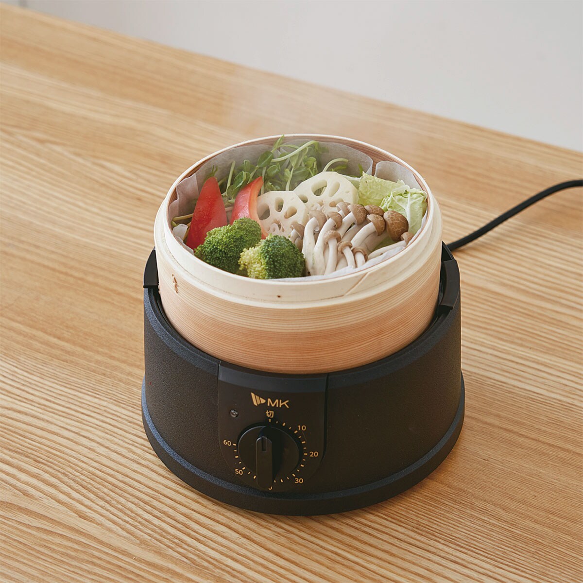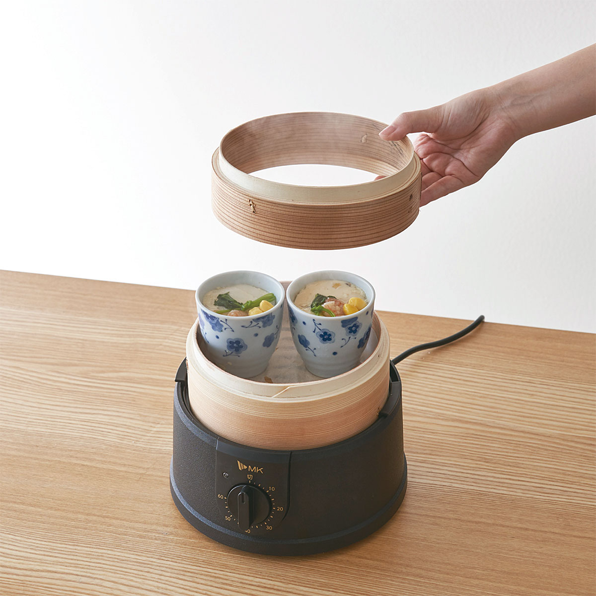 火加減や時間管理など面倒な手間を省いた電気式の「せいろ」です。水を張ったら、あとはダイヤル一つで蒸し料理ができるから、とっても簡単。肉まん、あんまんの温め直しから、蒸し野菜、おこわや赤飯などのもち米を蒸したり、蒸しパンやプリンなどお菓子作りにも使えます。2段式なので、同時に2品作ることも可能です。また、付属の延長輪を使えば、茶わん蒸しなど高さがある器でも調理できます。基本の蒸し料理から、おしゃれなワンプレート料理まで、色々載ってるレシピ付き。