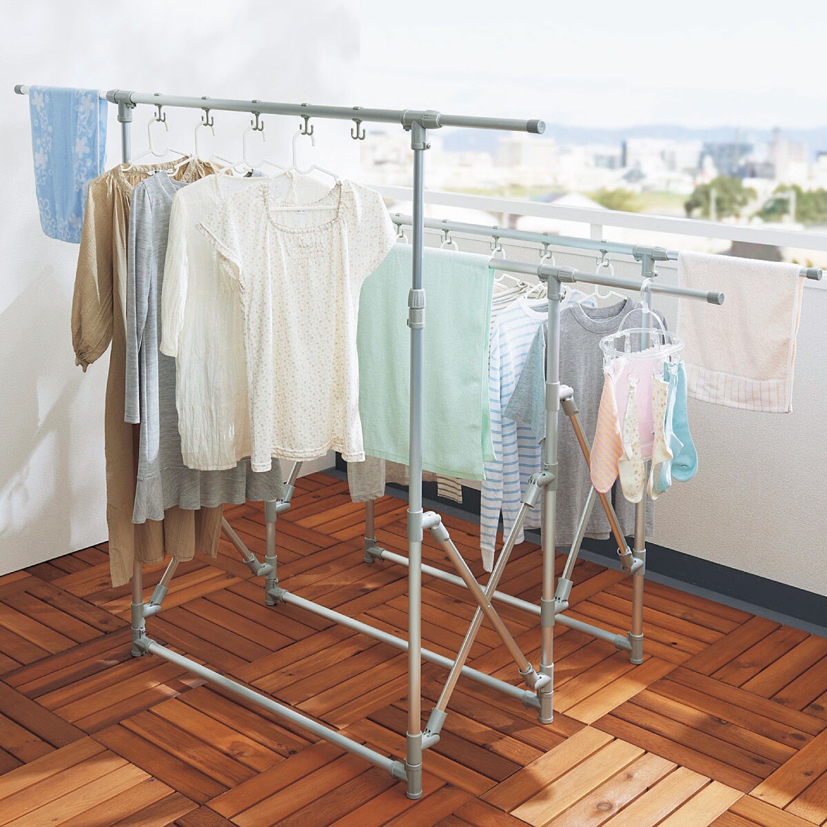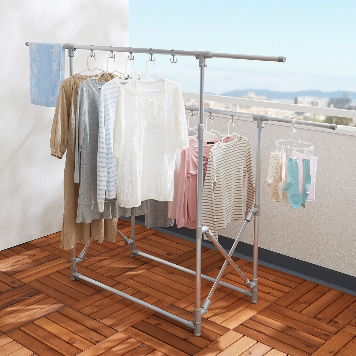 手前のバーの高さは120cmとベランダの塀から見えにくい高さに設計。幅・奥行きを自由に調節でき、奥のバーは高さも最大170cmまで調整できます。本体は軽くてサビにくいアルミ製物干しです。