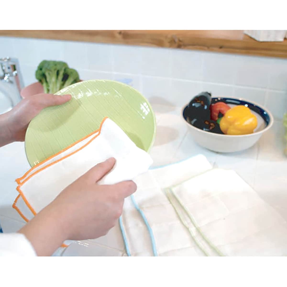 のりづけ無し、綿100%の吸水性・耐久性にこだわった手にやさしいガーゼふきんは何枚あっても重宝します。