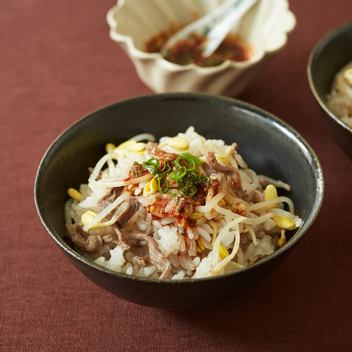 • <炊く><br>調理例:牛肉と豆もやしの炊き込みご飯