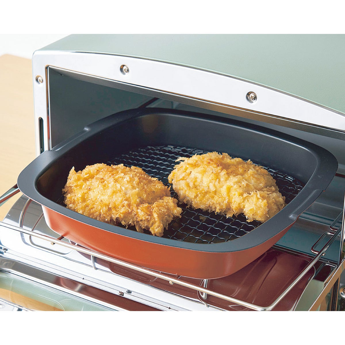 • 付属品(グリルネット)<br>ノンフライ調理に活躍。衣をつけた鶏肉をグリルパンに重ねたグリルネットにのせて加熱すれば、ヘルシーなから揚げに♪