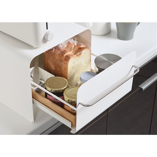 トースターの定位置はここに決定。トースターが乗せられるブレッドケース「UtaUブレッドドロワー」のコンパクト版です。パンのほかにジャムやコーヒーなど朝よく使うものをすべて収納。奥のものが取り出しやすいローラー式です。