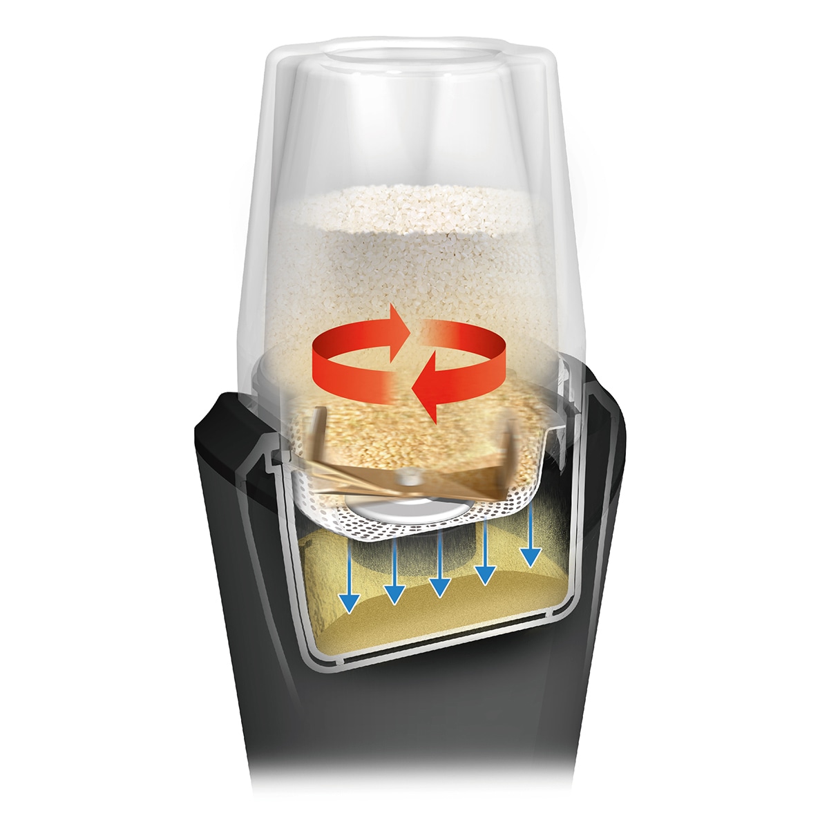 特殊形状の羽根がお米の対流をコントロール。お米同士の摩擦を誘発させ、無理なくぬか層を剥ぎとります。