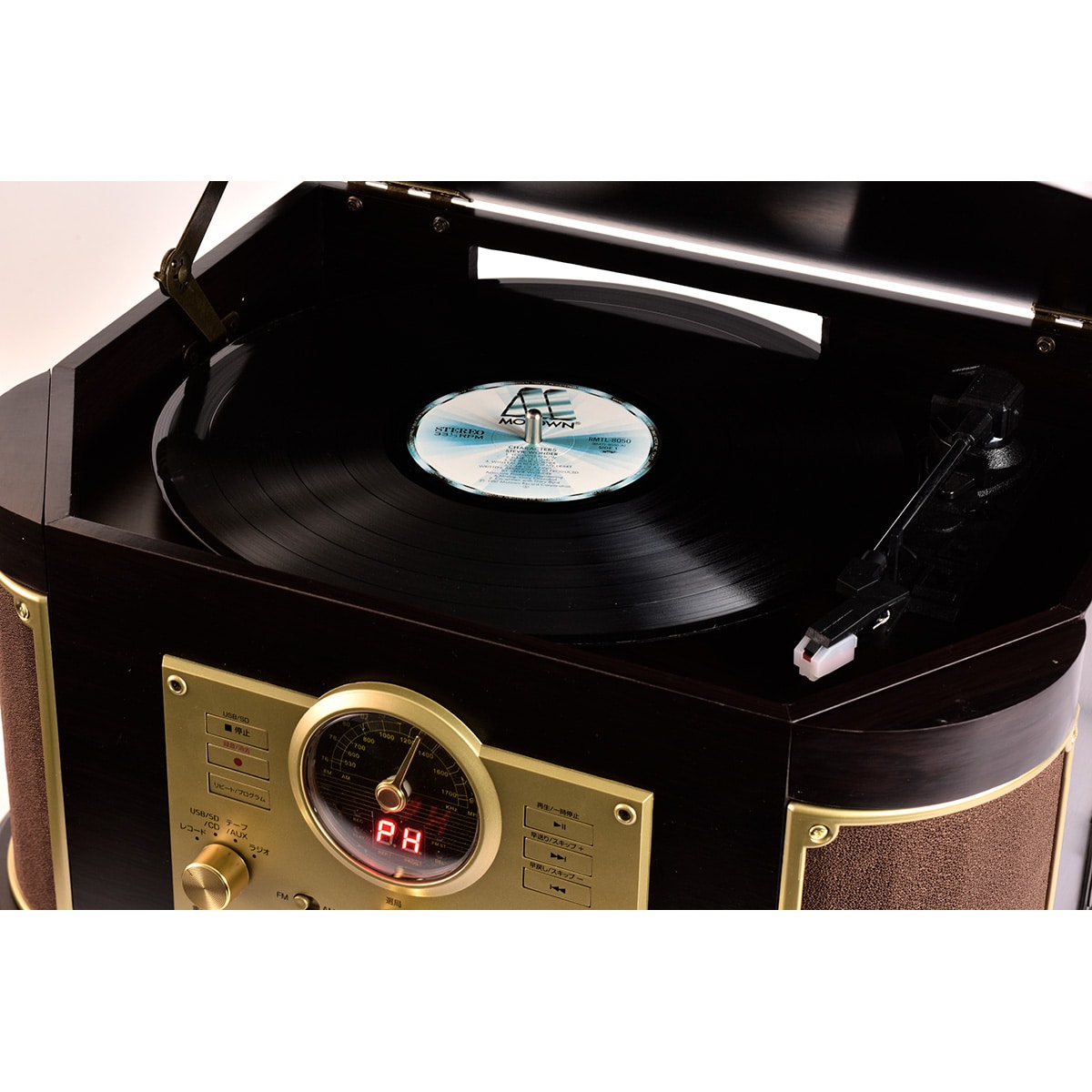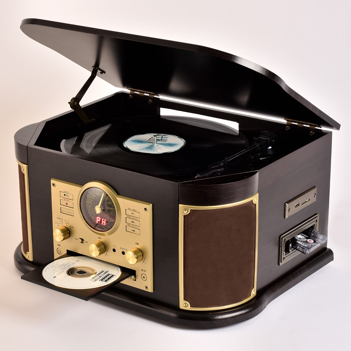 CDやラジオはもちろん、懐かしのレコードやカセットテープのサウンドを楽しめるマルチプレーヤー。操作は簡単、リモコン付きなので離れた場所からの操作も可能です。木製のキャビネット、クラシカルな佇まいも魅力。