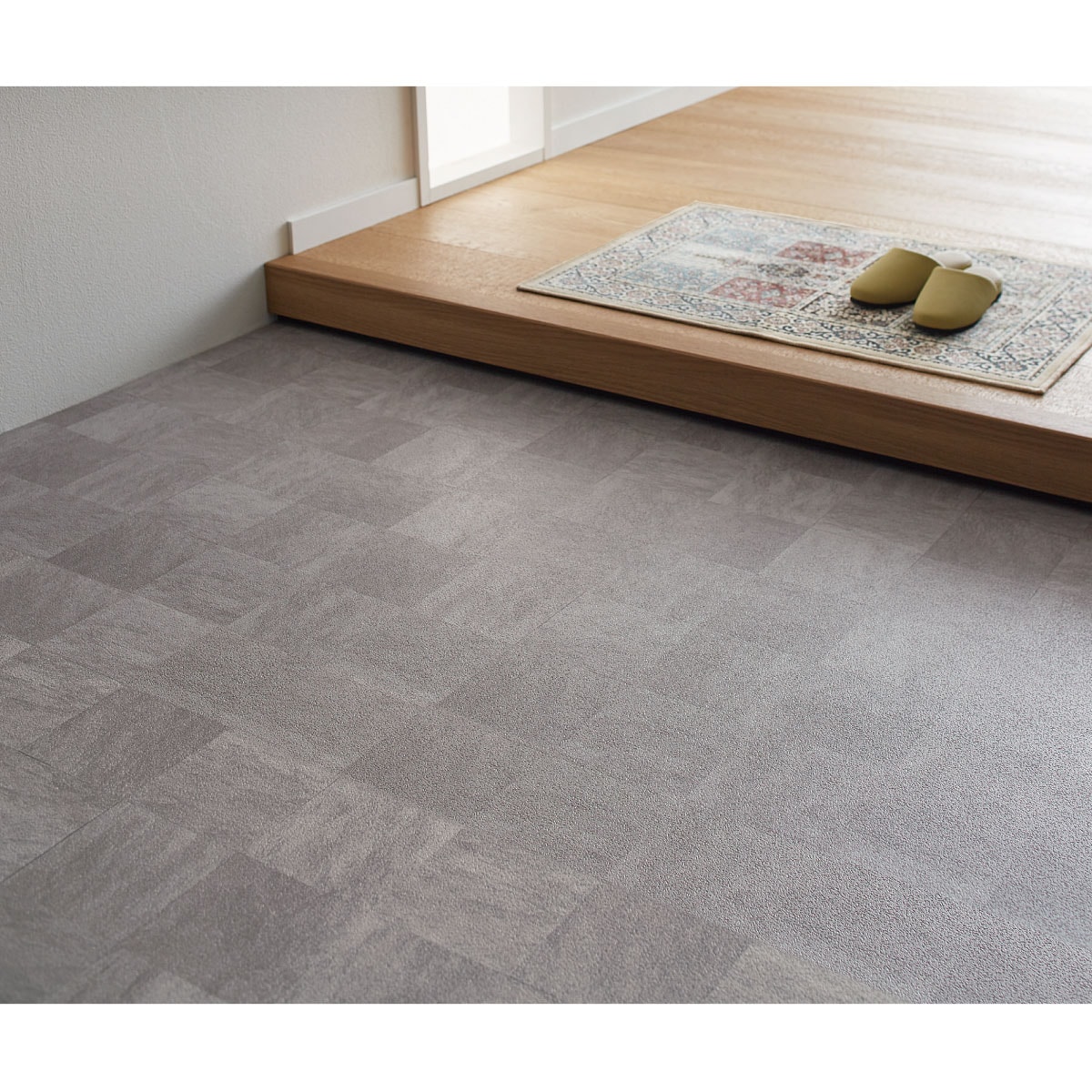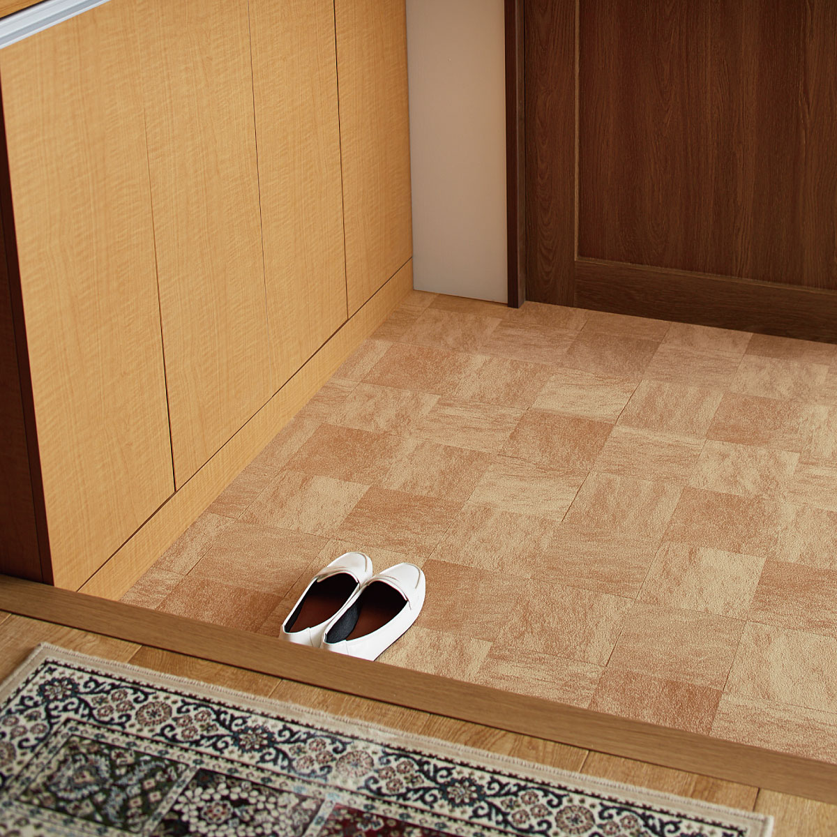 玄関床は防水性があり、へこみにくい専用シートで模様替え。汚れたら水洗いでき、お手入れも簡単です。防水性と耐久性のあるシートは、玄関だけでなくベランダやテラスの床にもおススメです。
