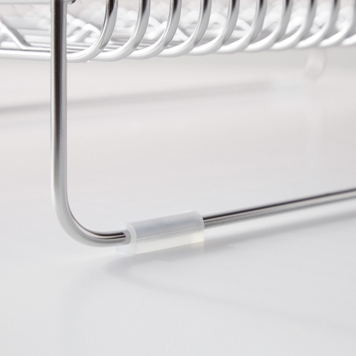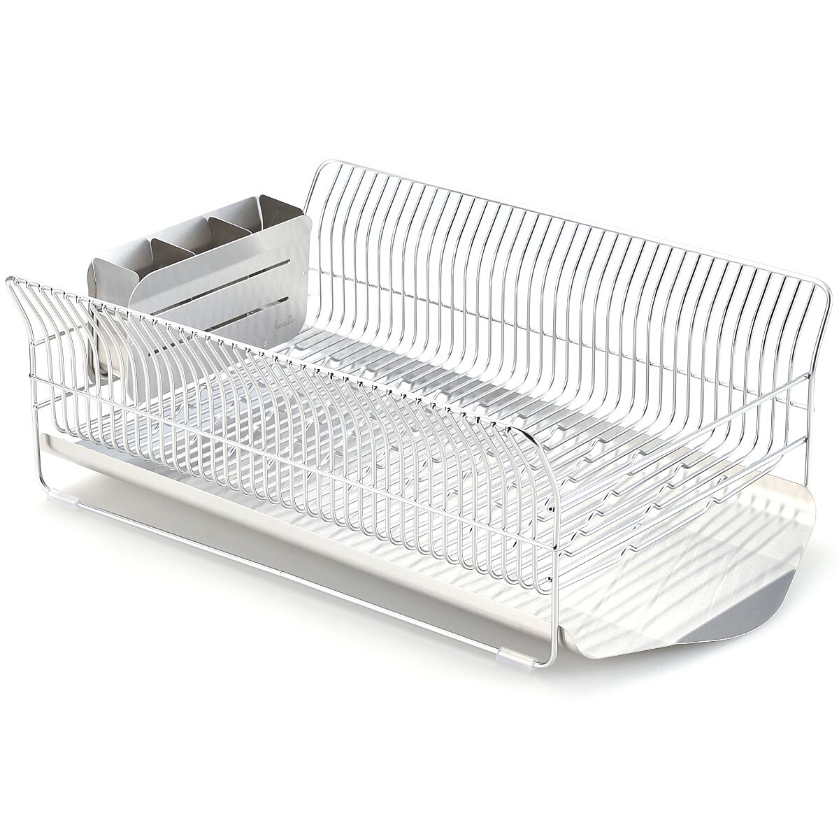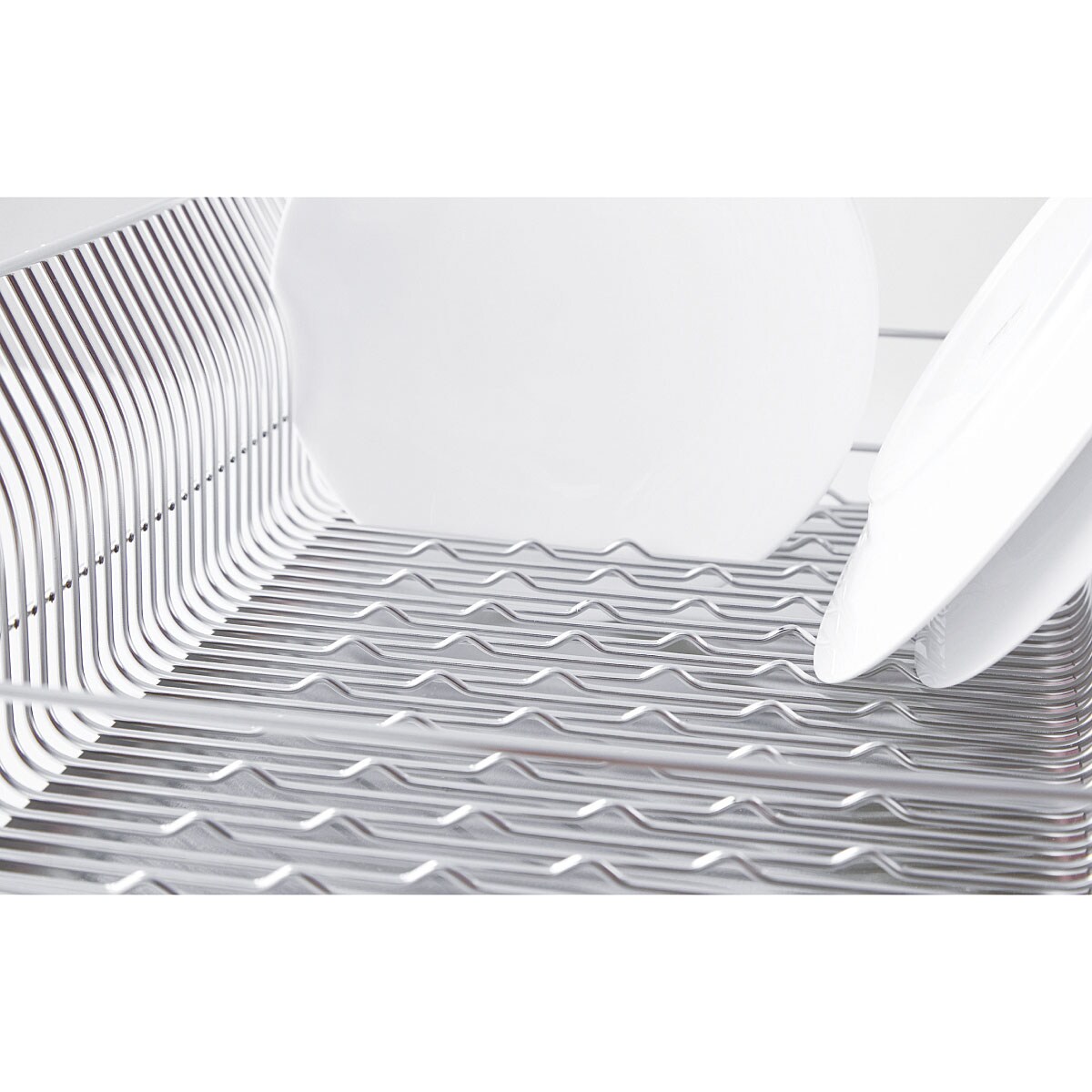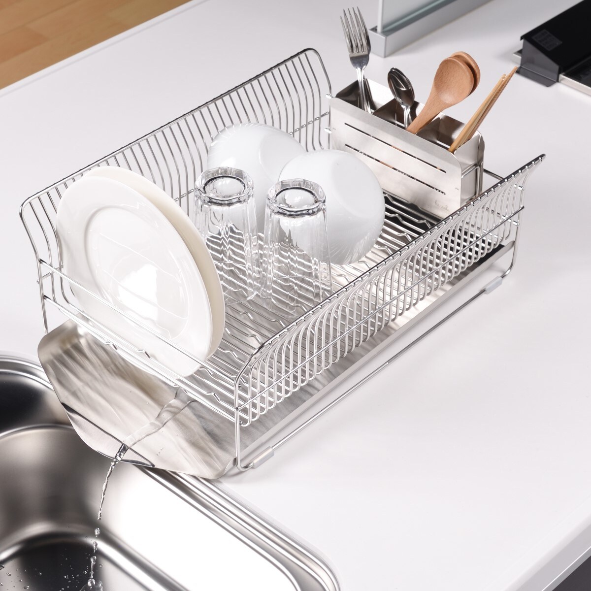 太めの線材を細かい間隔で配し、縦横自在にお皿が立つよう底面に波型の加工を施しているので、水で濡れた手でもお皿が置きやすく、滑りにくい機能的な形状。大きなお皿もサイドのカーブでやさしく支えます。付属の箸立てがリニューアルし、さらに使いやすくなりました。
