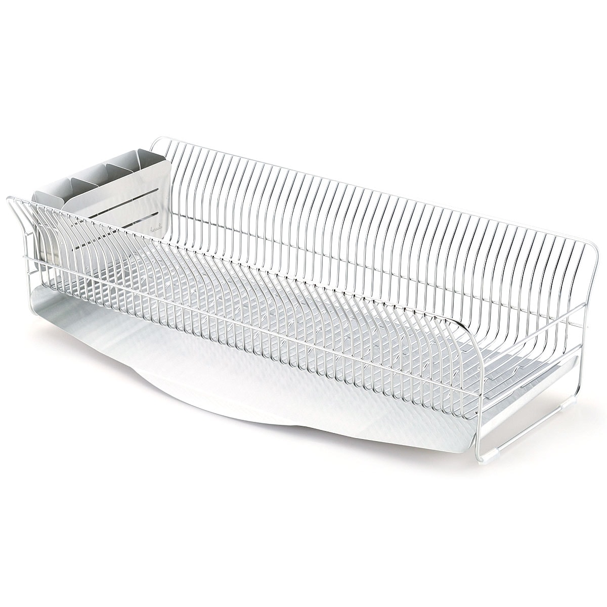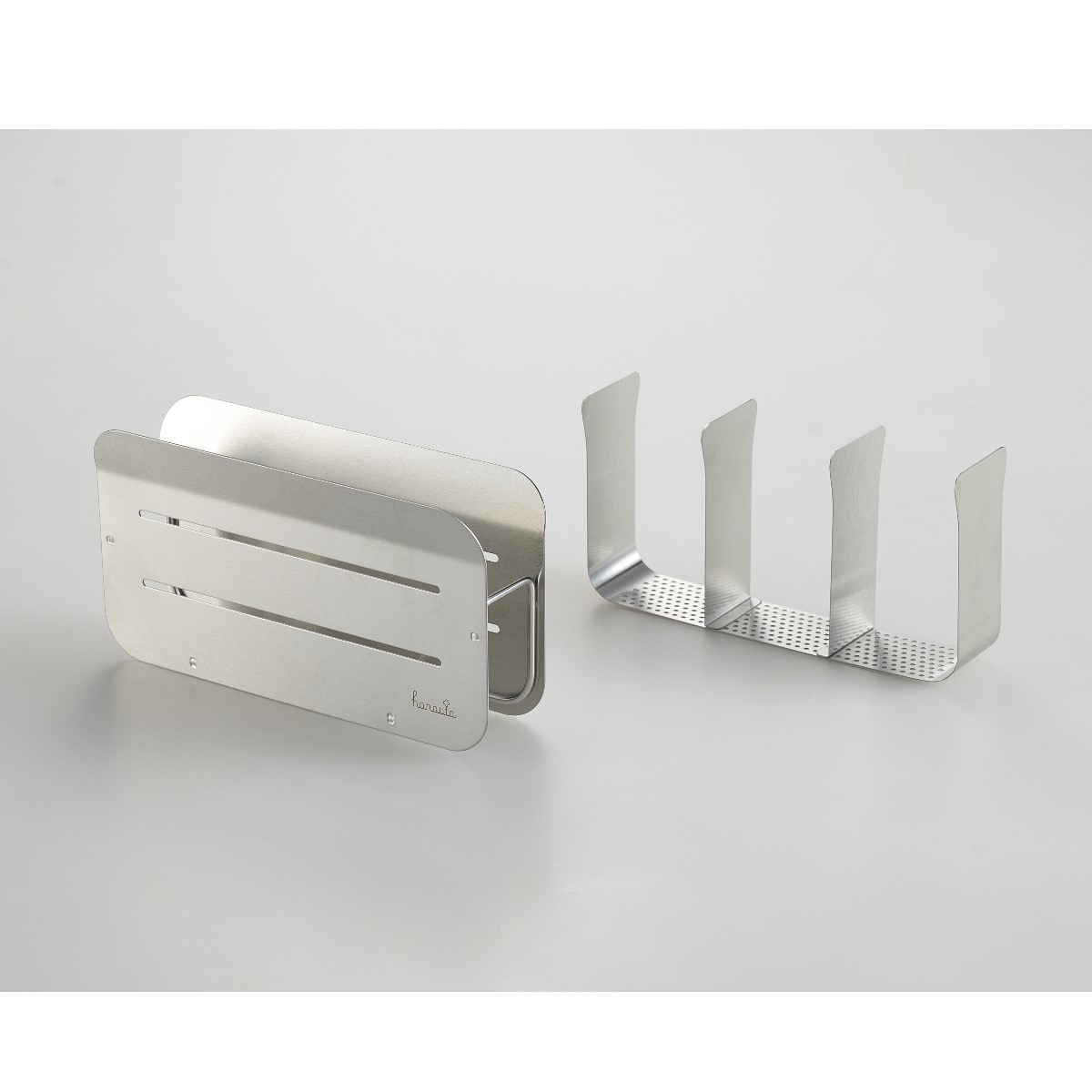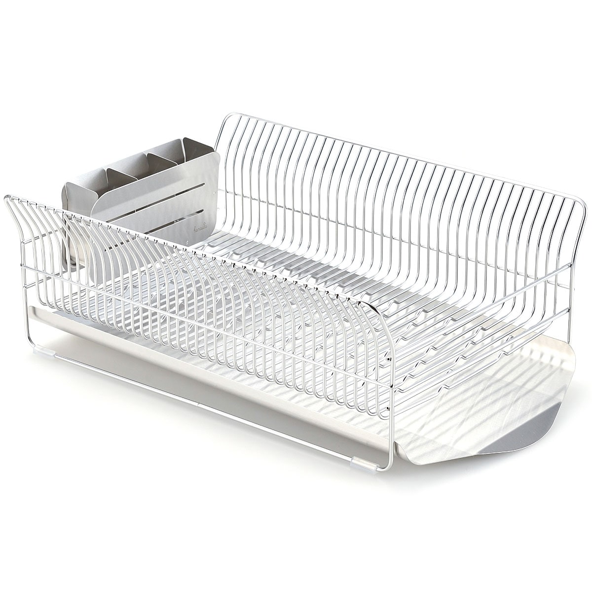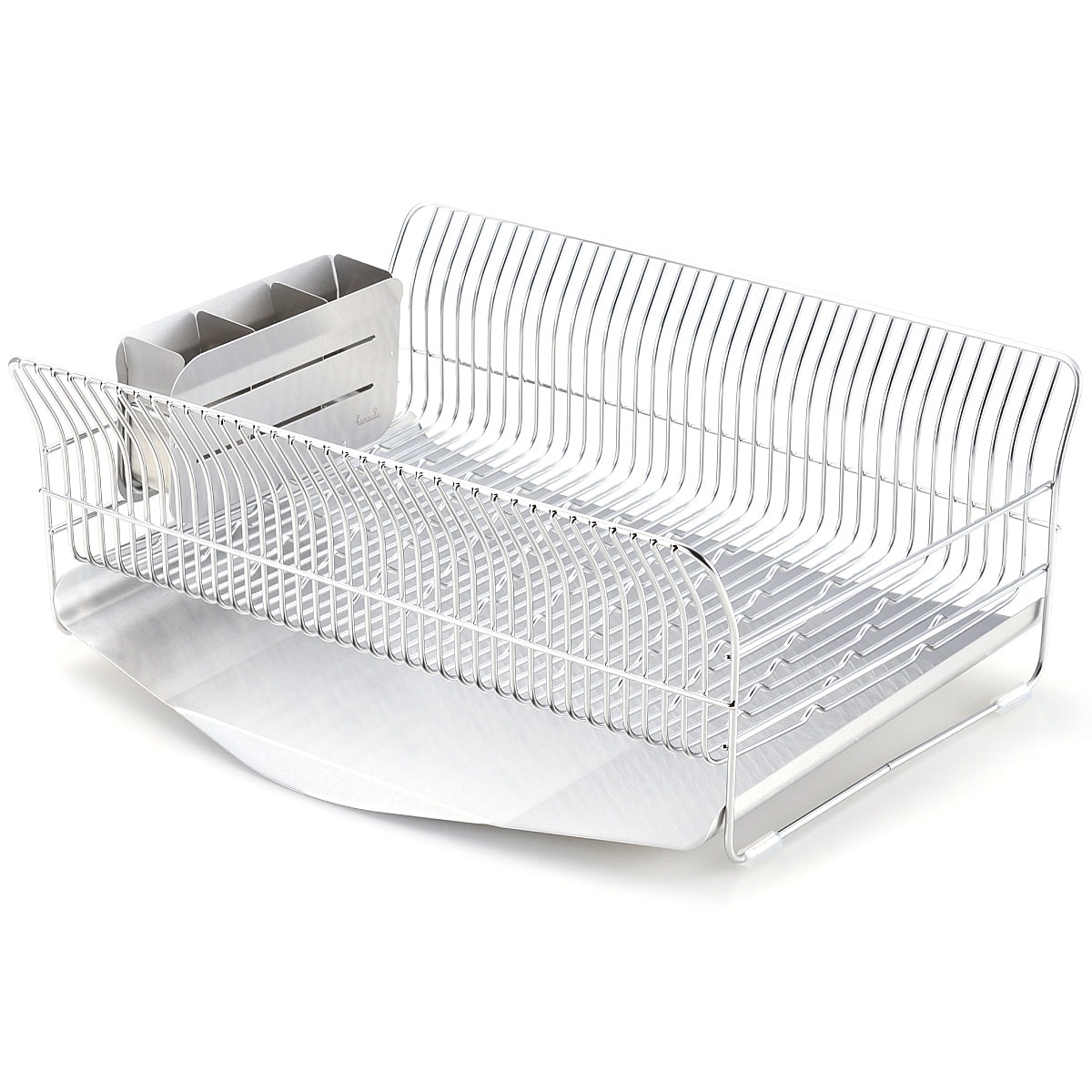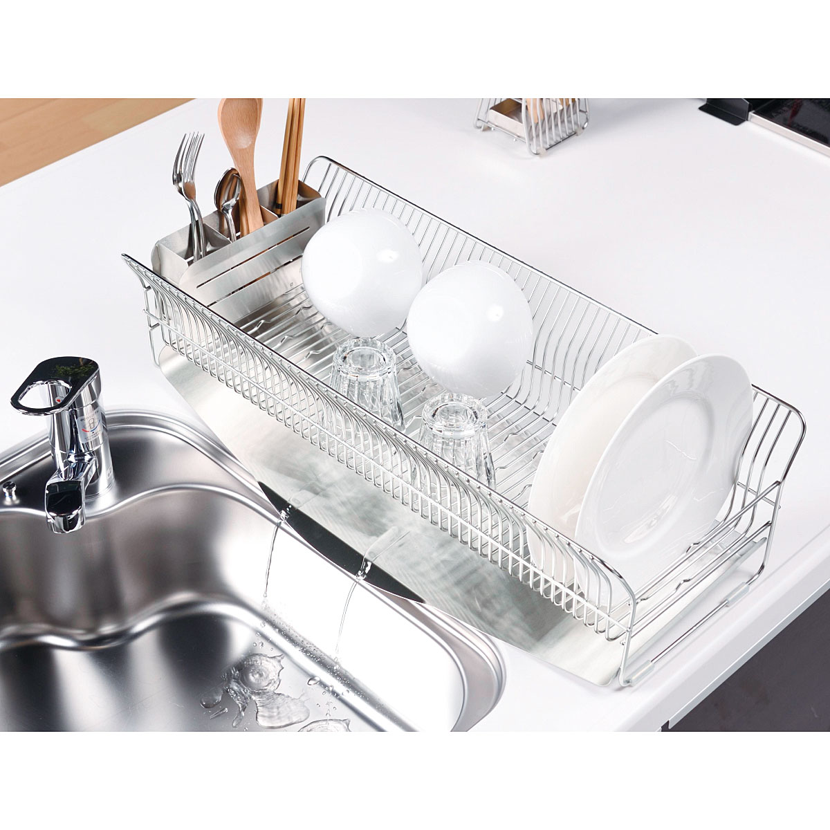 金属製品の産地として世界的に有名な燕三条地域の高い技術が光る水切りラックです。太めの線材を細かい間隔で配し、縦横自在にお皿が立つよう底面に波型の加工を施しているので、水で濡れた手でもお皿が置きやすく、滑りにくい機能的な形状。大きなお皿もサイドのカーブでやさしく支えます。付属の箸立てがリニューアルし、さらに使いやすくなりました。