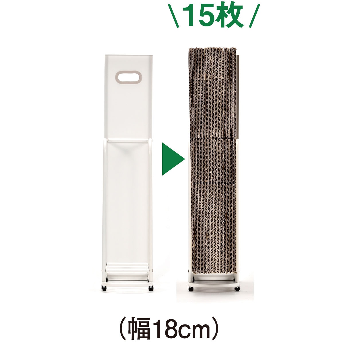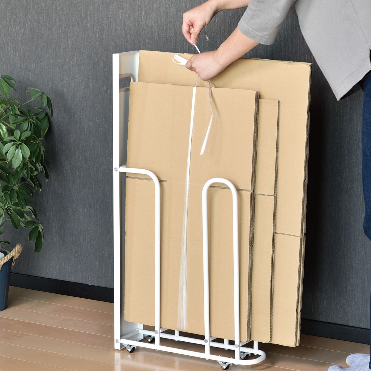 全面にある目隠しパネルで、ごちゃつく段ボールを見せず保管。下部はフレームのすき間から紐が通せて、収納したまま束ねることもできます。ちょっとしたすき間にスリムに収まります。