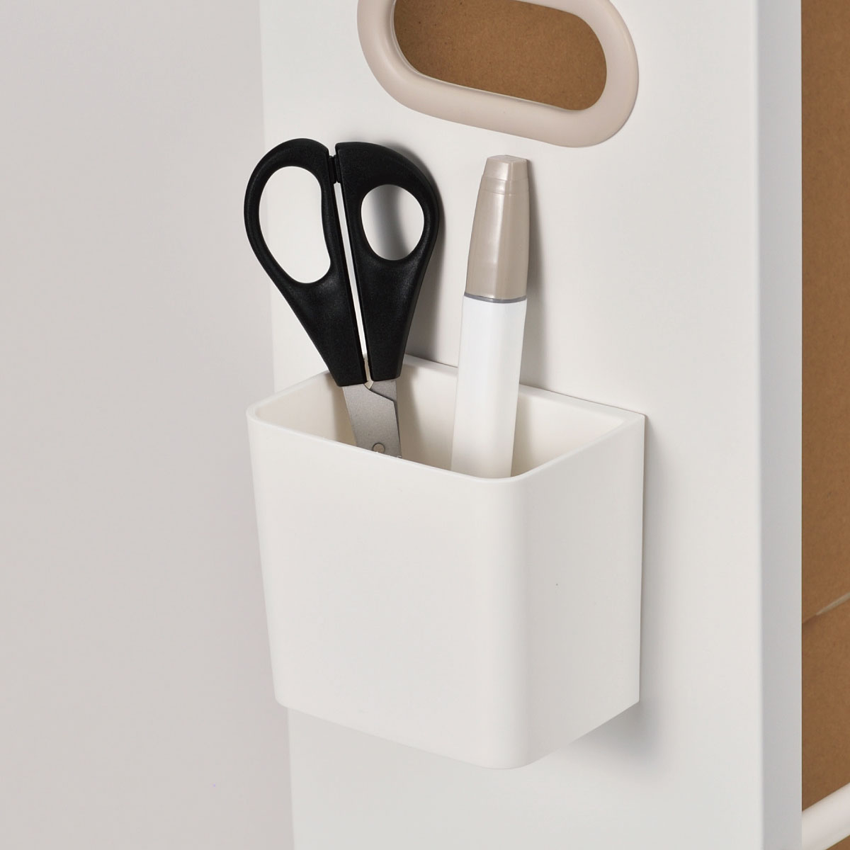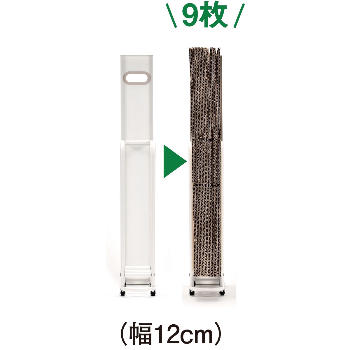 全面にある目隠しパネルで、ごちゃつく段ボールを見せず保管。下部はフレームのすき間から紐が通せて、収納したまま束ねることもできます。ちょっとしたすき間にスリムに収まります。