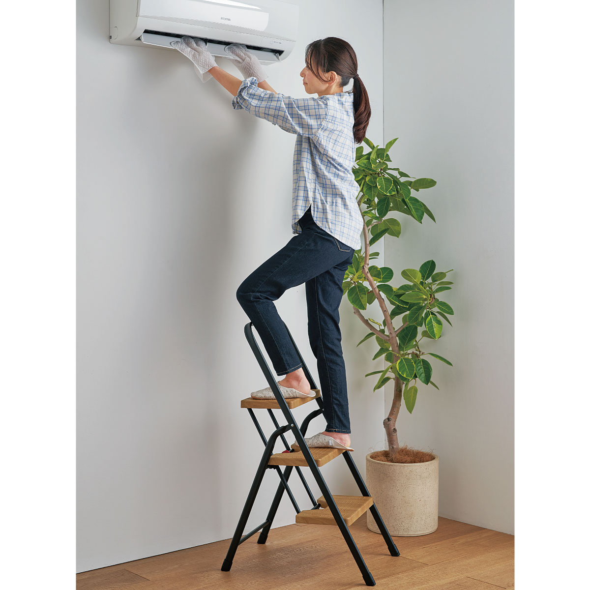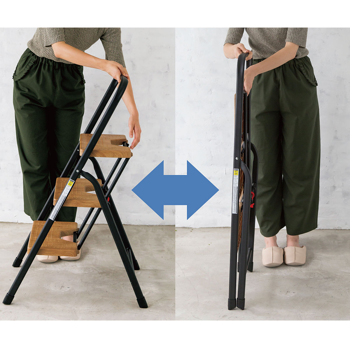インテリアになじむ木目調。幅広なステップ面は安定感があり、コンパクトにしまえるのも◎