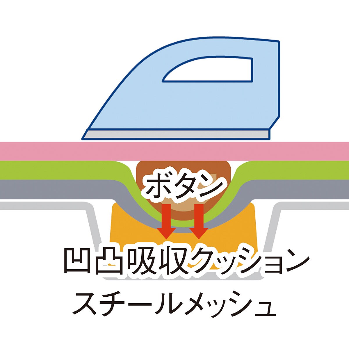 凹凸吸収構造の「ボタンプレスゾーン」は、ボタンが沈み込んで、上からきれいにアイロンがけできる仕組みです。