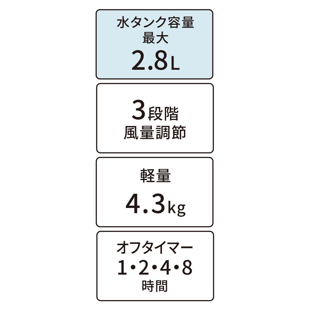 ■サイズ(約cm)/幅22×奥行23×高さ60 ■重量/約4.3kg ■電源/AC100V 50/60Hz ■消費電力/50/43W ●タンク容量/最大2.8L ●オフタイマー/1・2・4・8時間 ●風量設定/3段階 ●首振り/左右ルーバー、上下ルーバー(手動) ●コード長/約1.5m ●付属品/リモコン、保冷タンク●中国製【返品・交換不可】 【保証書付1年間】【小型別配送】「大型別配送」「小型別配送」の商品については※沖縄県や一部島しょ部など配送上の都合によりお届けできない地域がございます。