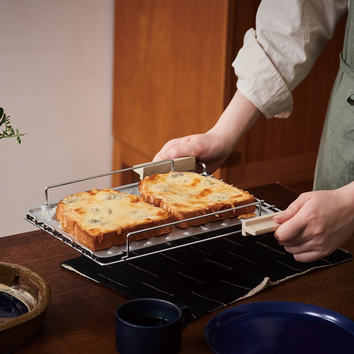 熱々の料理をテーブルへ。持ち手がトースターの外側にあるからやけどの心配も少なく、取り出しやすい♪