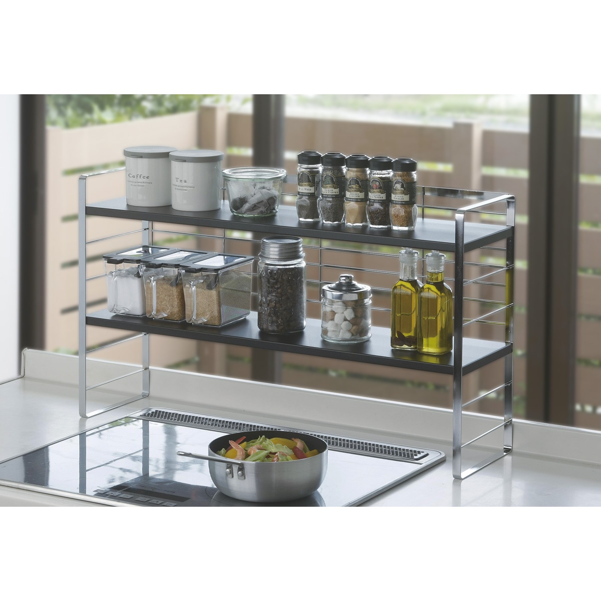 〈散らかりがちなキッチンにオススメ〉調味料やお鍋などの置き場にも!キッチンのスペースを有効活用できます。棚板は6段階の調節が可能。自分の好きな高さに調節できる!