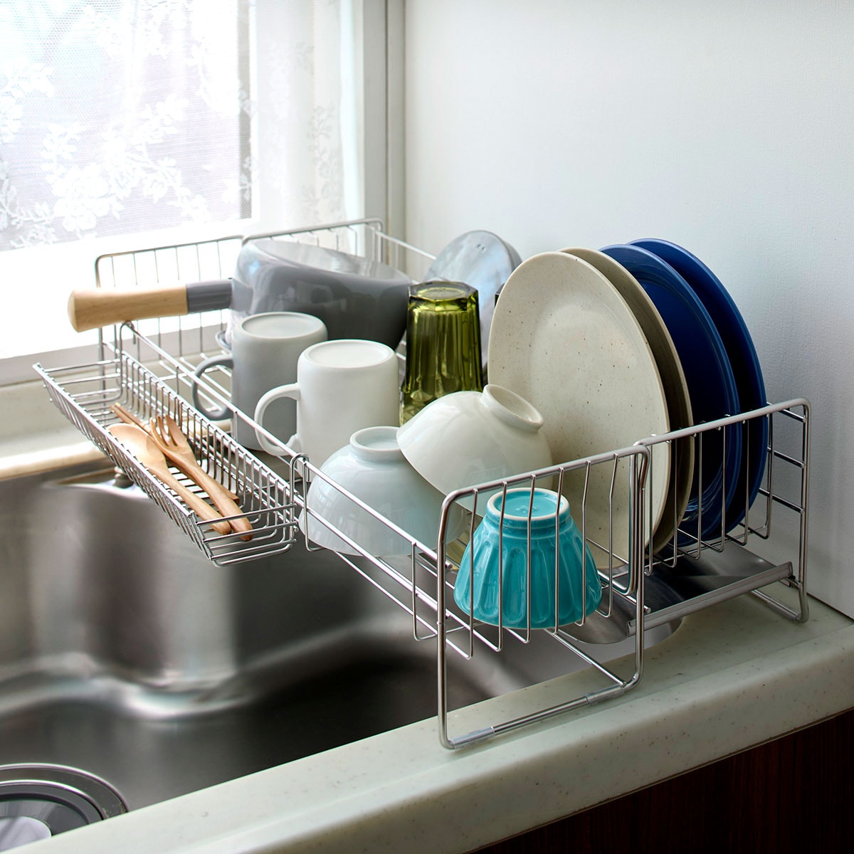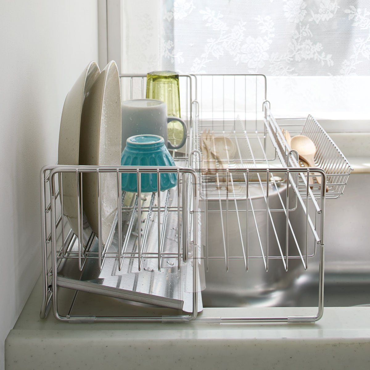 お皿が自立して幅が広がる水切り(小物ポケット付き)