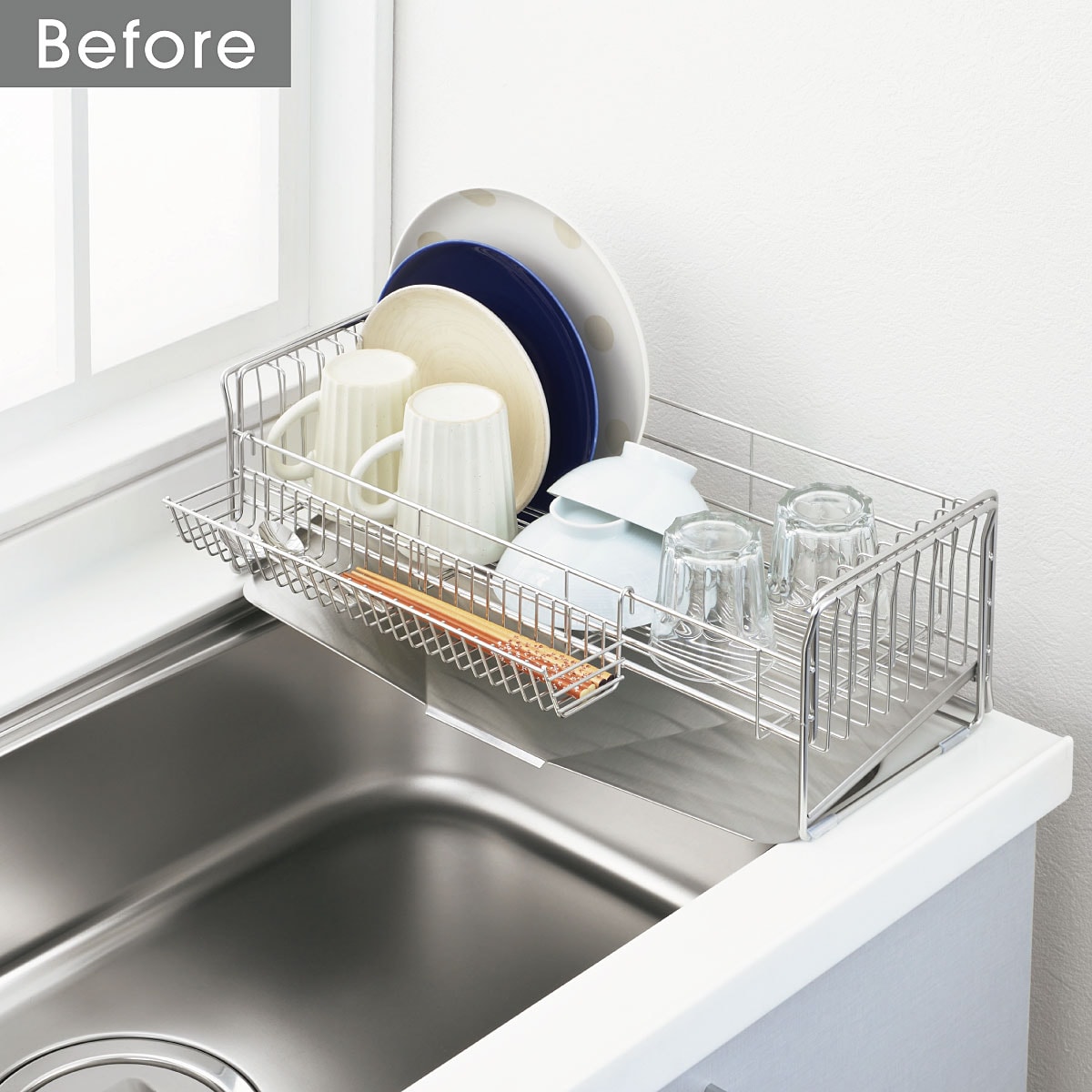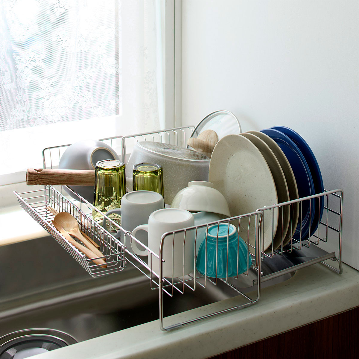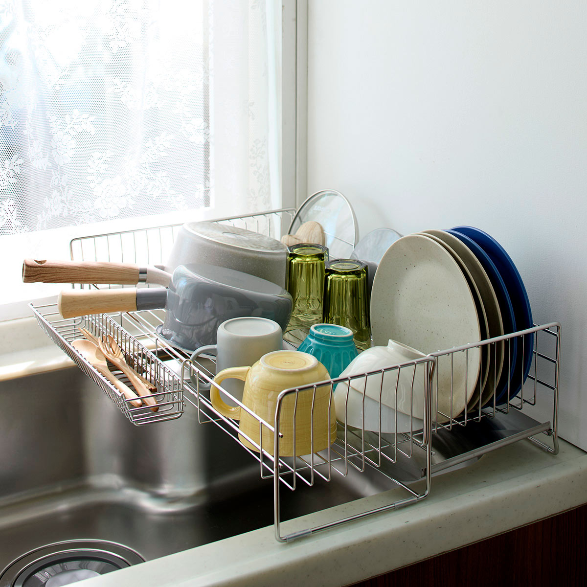 シンク横のデッドスペースにも置ける水切りカゴです。伸縮できるので、洗い物の量が多い時や鍋・フライパンがある時は伸ばして容量アップ。使わないときや洗い物が少しの時はスリムに収まります。【VO-1241よりリニューアルポイント】(1)お皿がビシッと自立ワイヤーを内側に入れることにより、お皿が自立。水切れがよく、取り出しやすく。(2)小物ポケットを改良小物ポケットの網目を細かくし、お箸がスルッと抜ける!を解消しました。小物ポケットのフックの角度を調整し、肘が当たってもガシャンと落ちない!