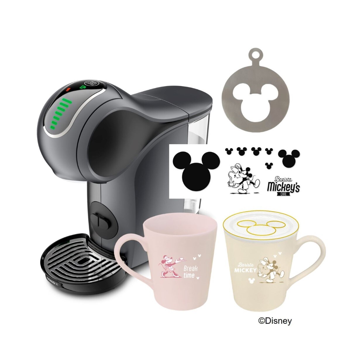 セット内容:ネスカフェドルチェグスト「ジェニオ エス タッチ」ブラック(スモークグレー)×1台ミッキーデザインの各種アクセサリー(ペアマグカップ×1セット・コースター×1枚・ステンシルプレート×1枚・ステッカー×1セット)※カプセルは付属しません
